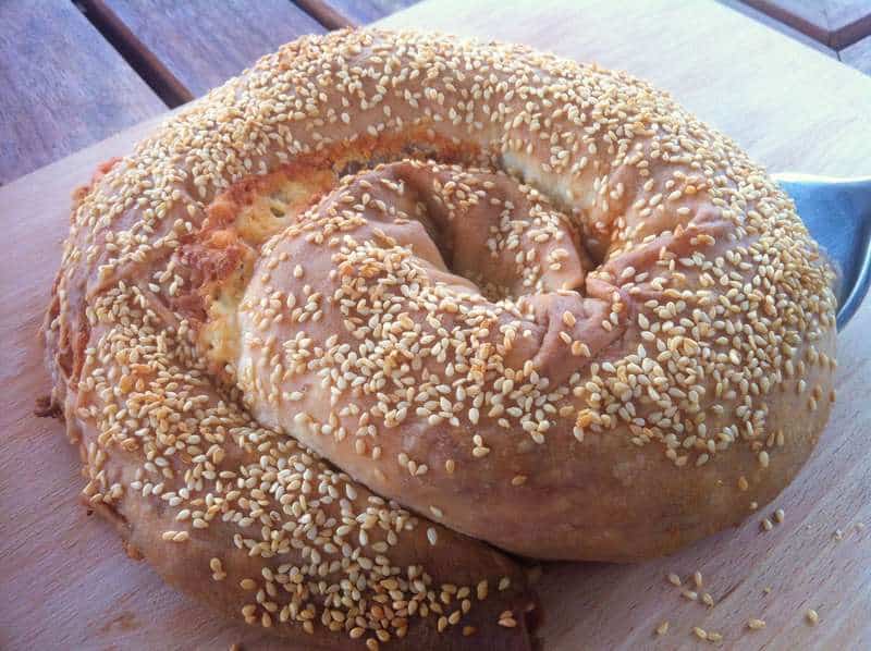 4. Place the dough on a large, floured kitchen towel and spread half the filling. Add in some small dices of butter for extra taste. Grab the kitchen towel by the edges lengthwise and lift it, so that the dough rolls. Turn it forming a snail and then place it on a baking tray. Butter with some melted butter and sprinkle sesame seeds. Repeat with the second ball of dough, experimenting into different shapes if you like.