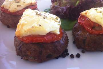 A delicious Greek bifteki (burgers) recipe topped with spicy feta cheese and a deliciously juicy grilled tomato! Some people, prefer their burgers neat, but Greeks enhance the flavor of their burgers (bifteki) with fresh herbs, like oregano, spearmint and parsley giving them a unique taste.