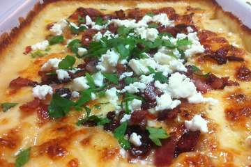 The perfect potato gratin recipe! Imagine luscious layers of the most creamy béchamel-based sauce, sweet caramelised onions, tangy and salty feta cheese and tender potatoes, topped with crispy bacon and Parmesan cheese..