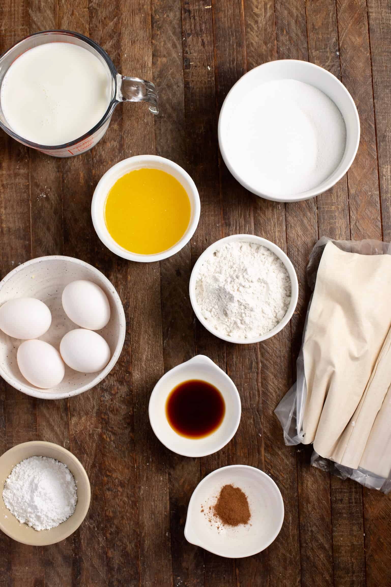 Pie ingredients: Along with phyllo dough, you’ll want some melted butter, sugar, milk and all-purpose flour. You will also need eggs and some vanilla extract.