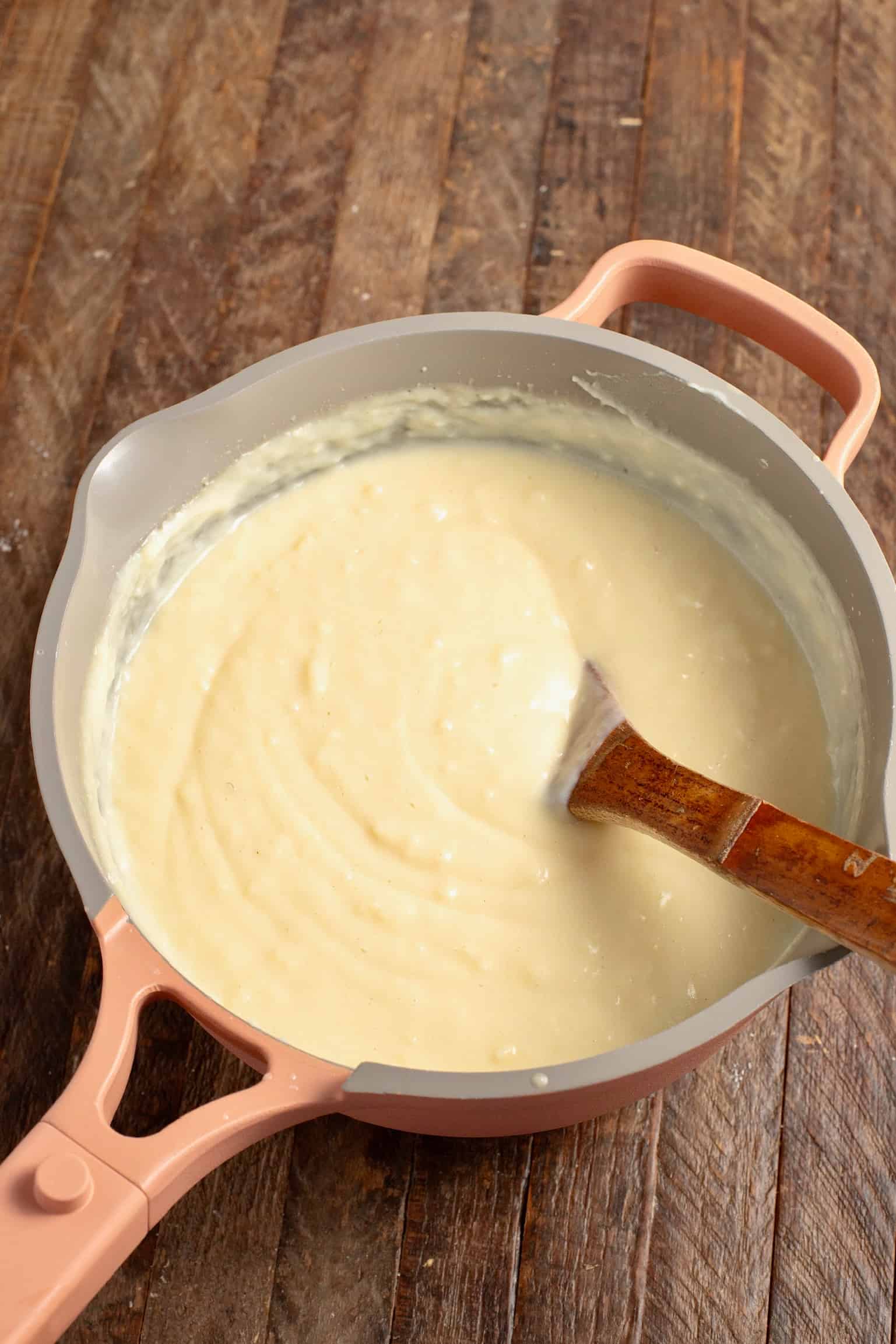 - Turn the heat down. Add the flour & milk mixture into the saucepan with the remaining warm milk. Whisk very quickly, until the mixture has thickened and is smooth and creamy. Do not remove the pan from the stove while whisking. This should take 2-3 minutes.