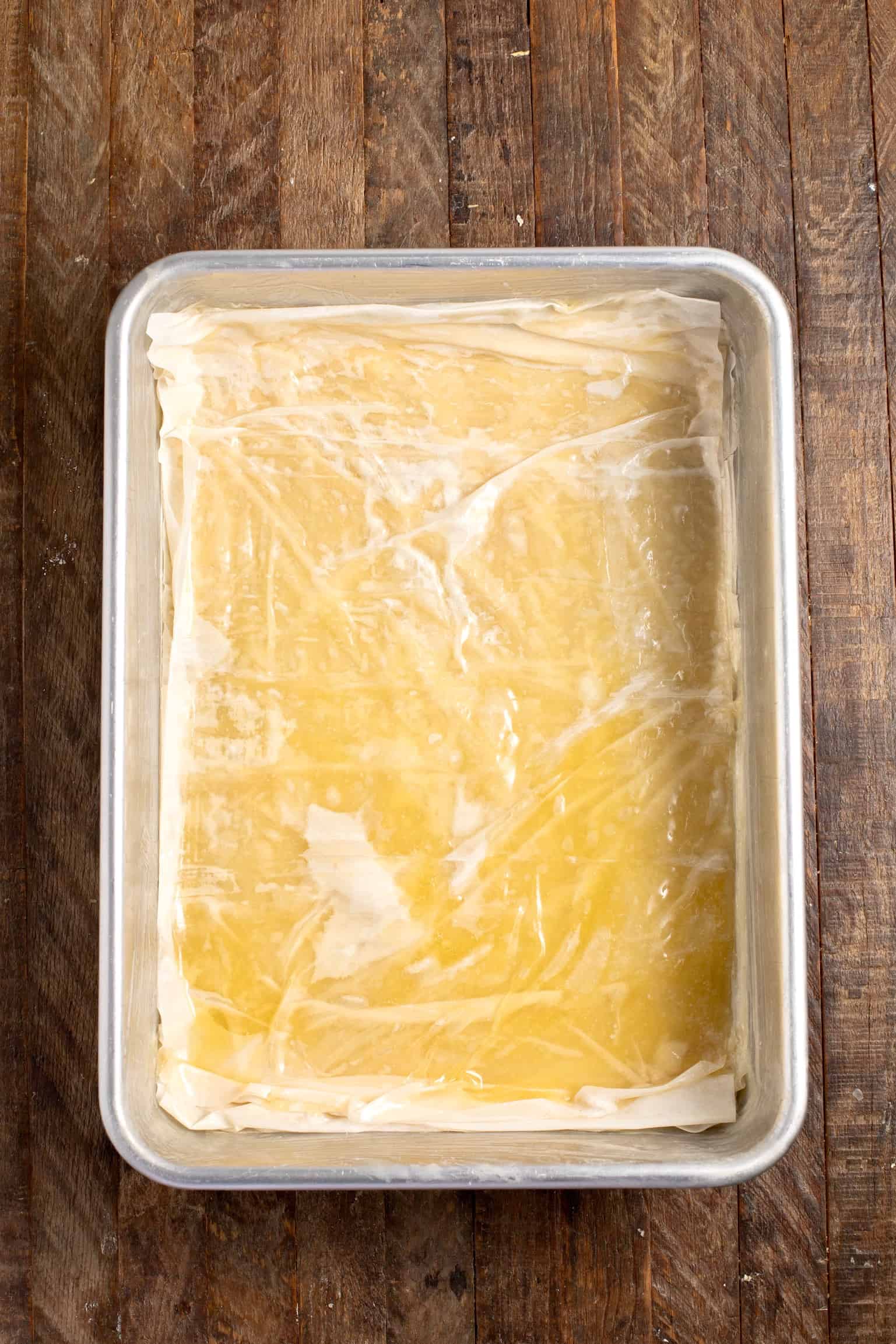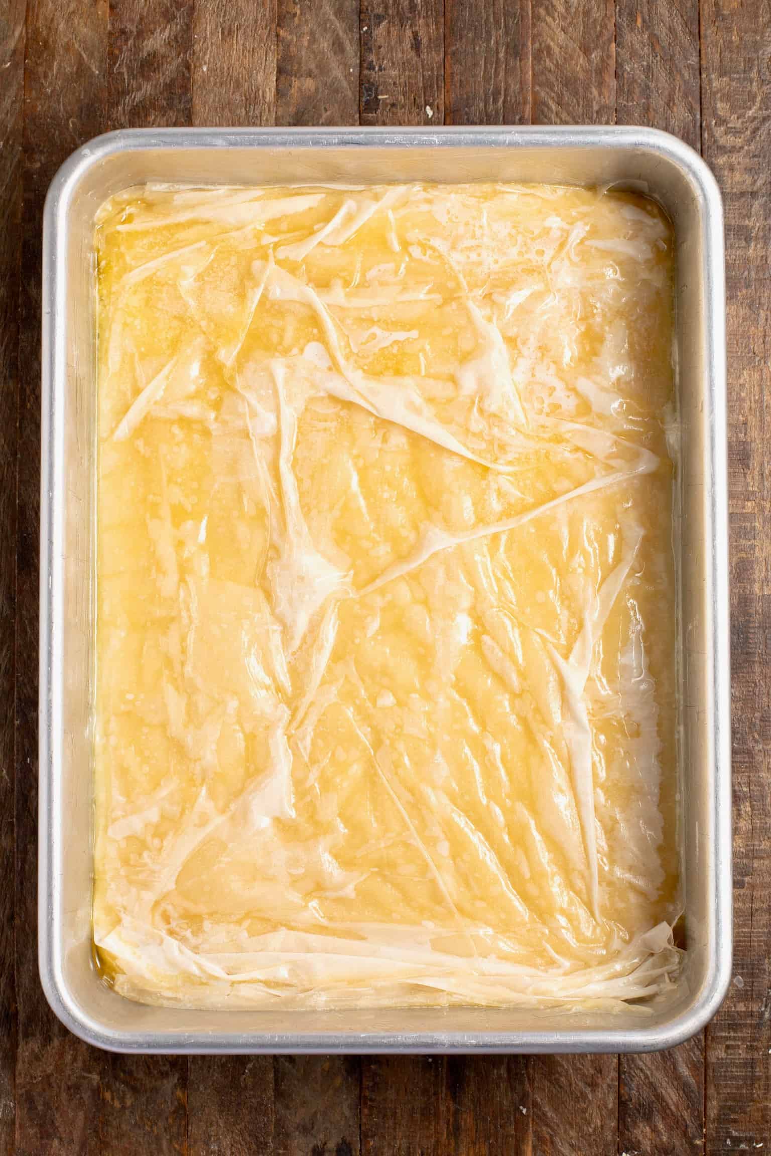 - Begin by layering the sheets one by one on the bottom of the tray, making sure to sprinkle each one thoroughly with melted butter. Tip in the custard from step 4, smoothing the surface with a spatula and fold the phyllo sheet flaps over the custard.