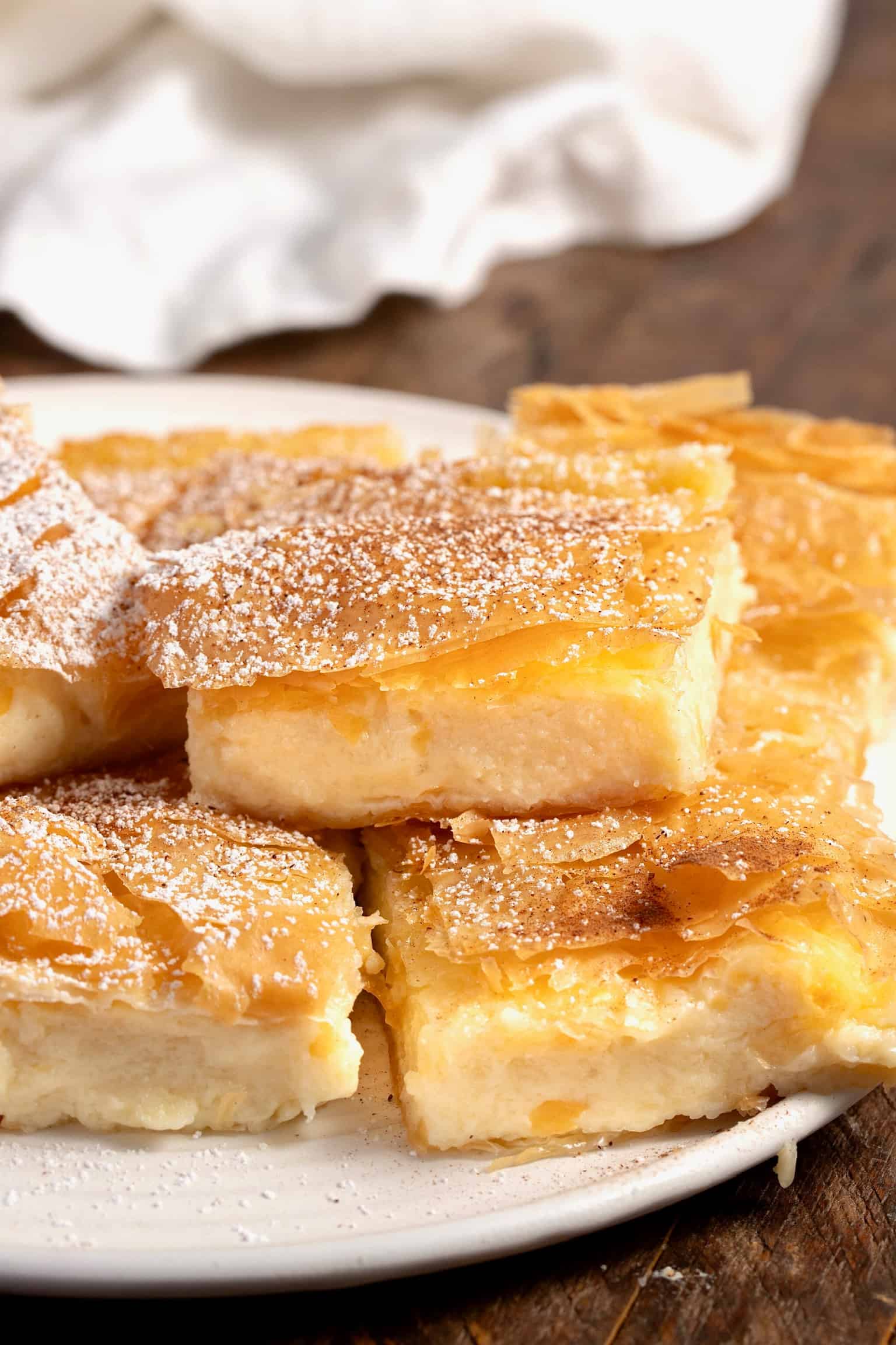 The authentic greek bougatsa recipe! A traditional Greek dessert made with the most creamy custard wrapped in golden brown crispy phyllo, sprinkled with melted butter and garnished with icing sugar and cinammon.. Simply amazing!