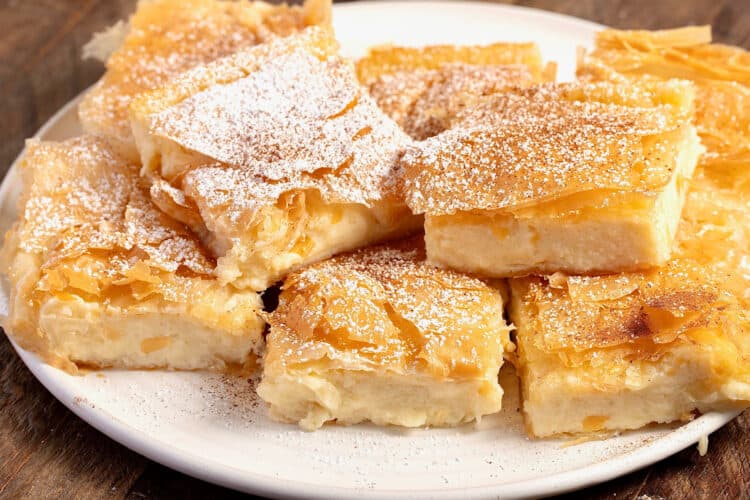 Golden and creamy perfection! Bougatsa (Greek custard pie with phyllo) is a traditional Greek dessert made with the most creamy custard wrapped in golden brown crispy phyllo, sprinkled with melted butter and garnished with icing sugar and cinammon.. Simply amazing! A traditional Greek dish, perfect for every time of the day, as a delicious snack or as a filling dessert.