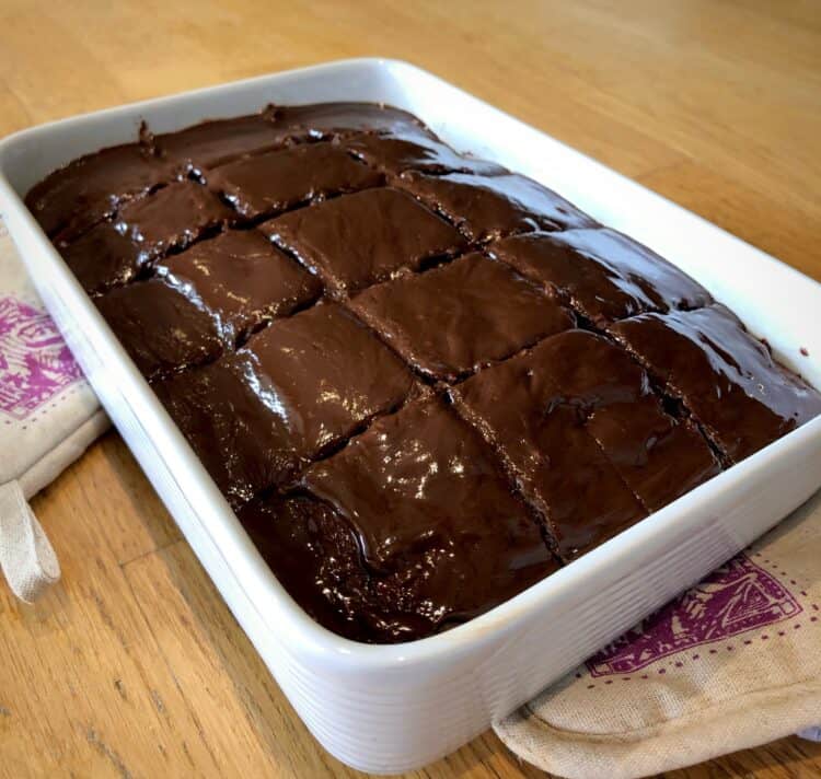 Use a fork to make some holes on the cold cake and then pour the hot chocolate sauce. This will enable the sauce to penetrate the cake and soak in, just like using a chocolate syrup! The best part? Because its slightly thicker, its so much more indulgent!