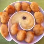 - Into a deep frying pan, heat the oil to high heat. Add some four into a bowl. Take one piece of cod and dredge into the flour, shaking it to remove the excess flour and then deep it into the batter, flipping it on all sides. Using a spoon remove the cod from the batter and put it slowly into the hot oil. Dip the spoon into some water and repeat with the rest of the pieces. Deep fry the cod fritters flipping them with allotted spoon, until nicely colored on all sides. Remove the cod fritters from the pan and place on some kitchen paper to drain. (Fry the cod fritters in batches, so that the surface of the pan is comfortably filled.)