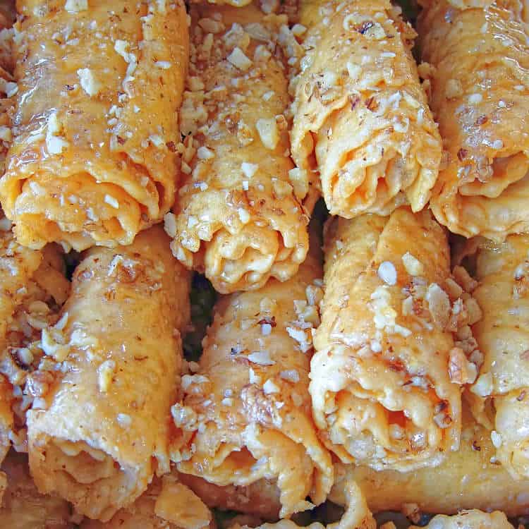 - Place the diples on a serving platter and drizzle with the syrup (or if you like them extra syrupy, soak each one in the syrup for a few seconds). Sprinkle with ground walnuts and cinnamon.