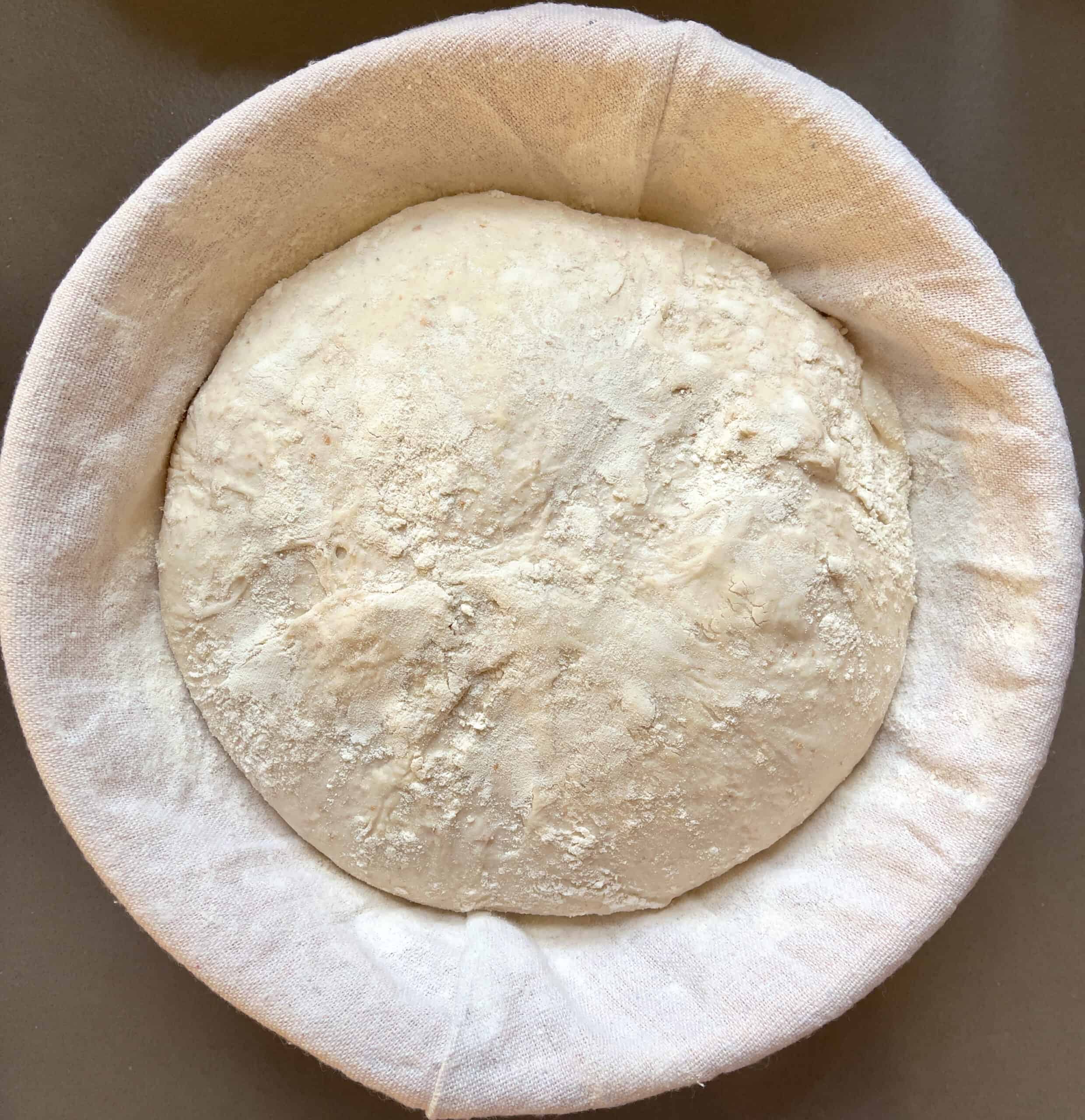 - Use a proofing basket (or a bowl)! Your dough will be a bit slack when coming off the mixing bowl so you need a container that will help it keep its shape when rising for the second time. If you are planning to bake often get yourself a 25 cm / 10 inch bread proofing basket (banneton) from Amazon. Alternatively, you can use a large bowl, lined with a thick weaved terry cloth, linen cloth or tea towel.