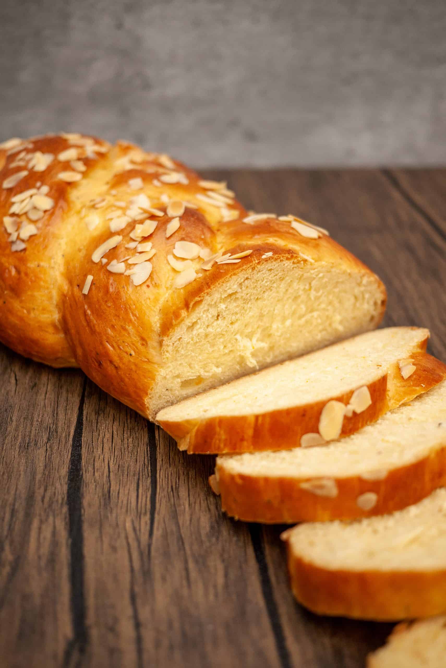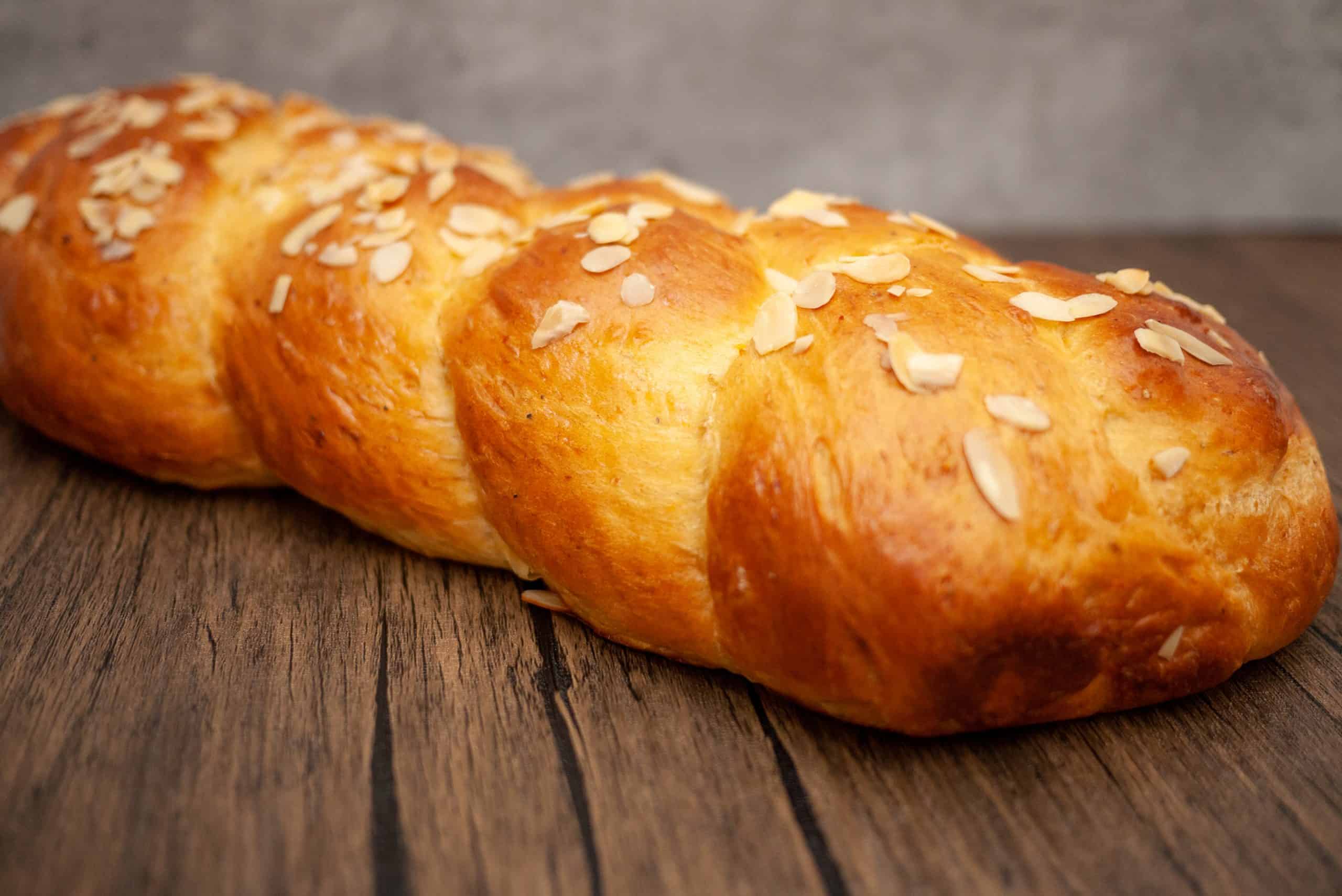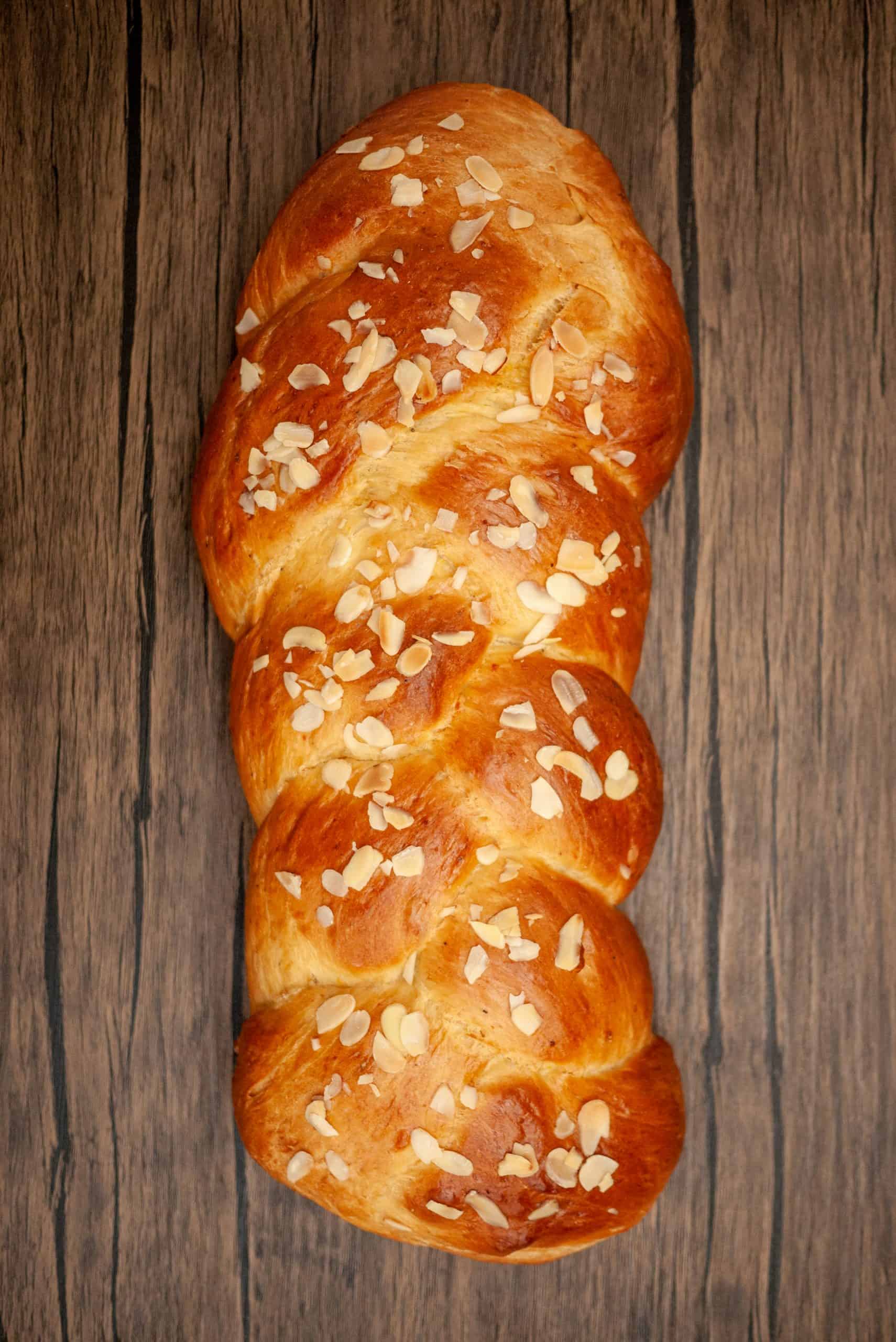 Finally, sprinkle on your almond slivers and put your easy tsoureki in the oven. Bake it for approximately 45 minutes or until golden brown throughout. As most ovens don’t distribute their heat evenly, half way through the baking time rotate your baking tray to make sure all sides of your tsoureki brown evenly!