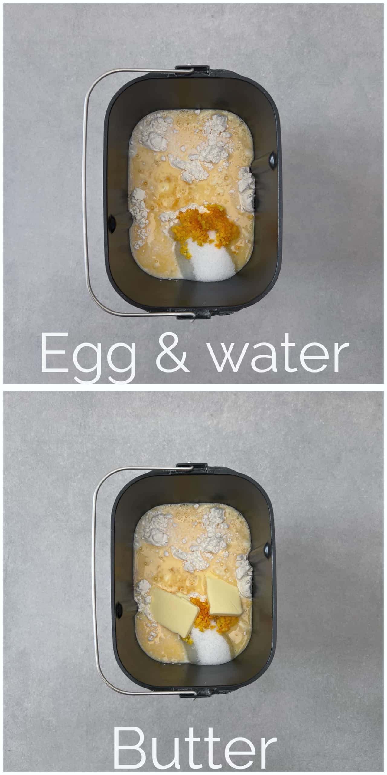 - In the bread machine bowl, pour in the milk and the egg-water mixture and add half the butter.