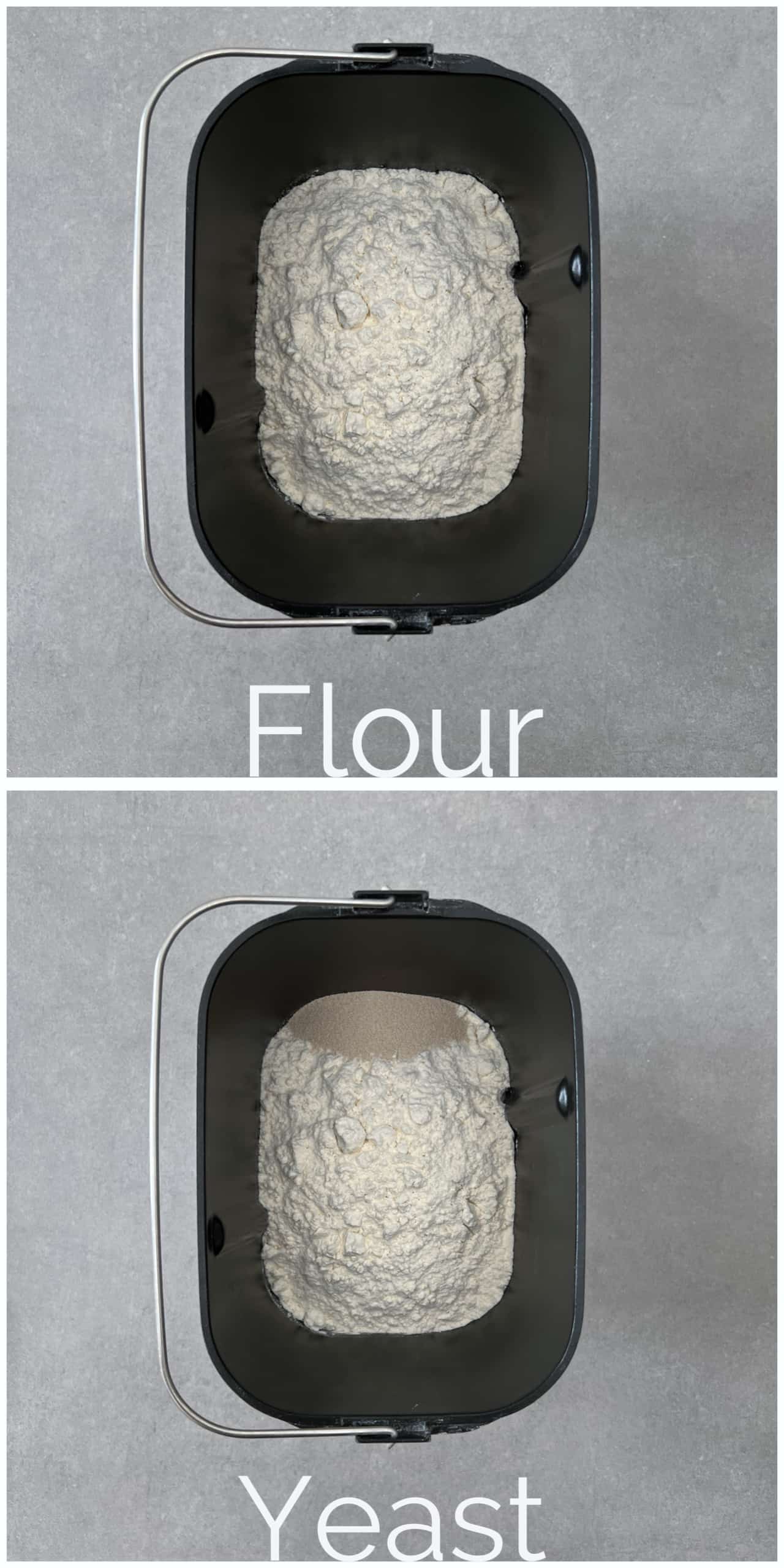Firstly you’ll need to add your flour to the bread machine bowl. Make sure you shake the bowl a little so that the flour is spread evenly at the bottom of the bowl.
