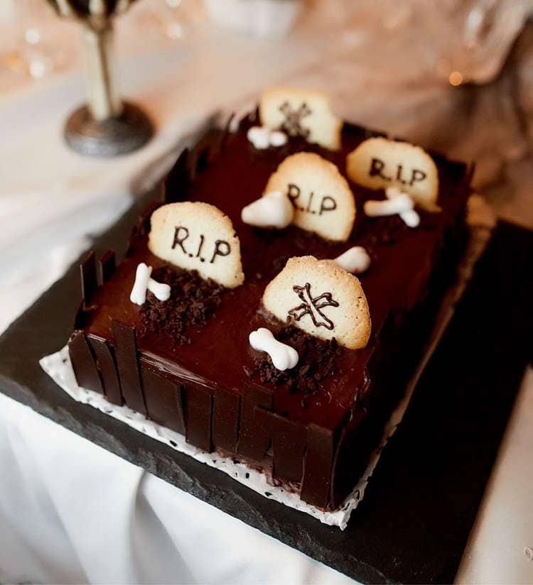 3. To make this scary Halloween cake recipe truly scary its time to make some tombstones! Heat up the cream in a saucepan until right before boiling, break up the chocolate and add one piece at a time and watch it melt! Stir till even. This will be the chocolate layer for our gravestones! Dip the tea biscuits in the mixture one at a time and set aside to cool. The rest of the mixture will be poured over the cake for a nice chocolate finish! To add an extra layer of crunchiness, blend the chocolate cookies in a hand blender or just smash them up with a rolling pin until small crumbs form – careful not to overdo it! Sprinkle on top of the hot chocolate covering the cake.