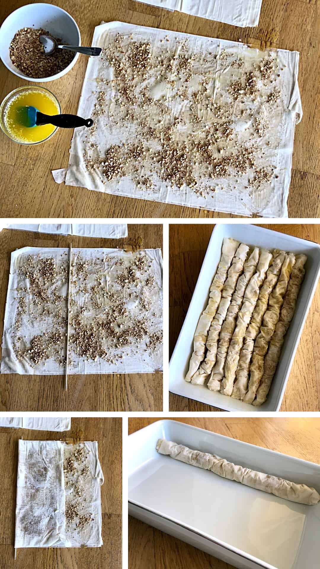 - Then it is time to shape into a roll. Take 2 wooden skewers and place them on the sheets of phyllo like seen in the pictures (not too tightly). Then using your hands, press the ends towards the middle tucking them inside and remove the skewers. Place on your baking dish and repeat with rest.