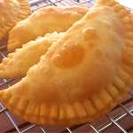 4. Using a rolling pin, roll out the dough (approx. 0.2cm thick), on a floured surface, and cut some circles (about 12 cm diameter), as seen in the picture. Place a full spoon of the filling on each circle and fold the dough, creating a half-moon. Join the edges well, using a fork.