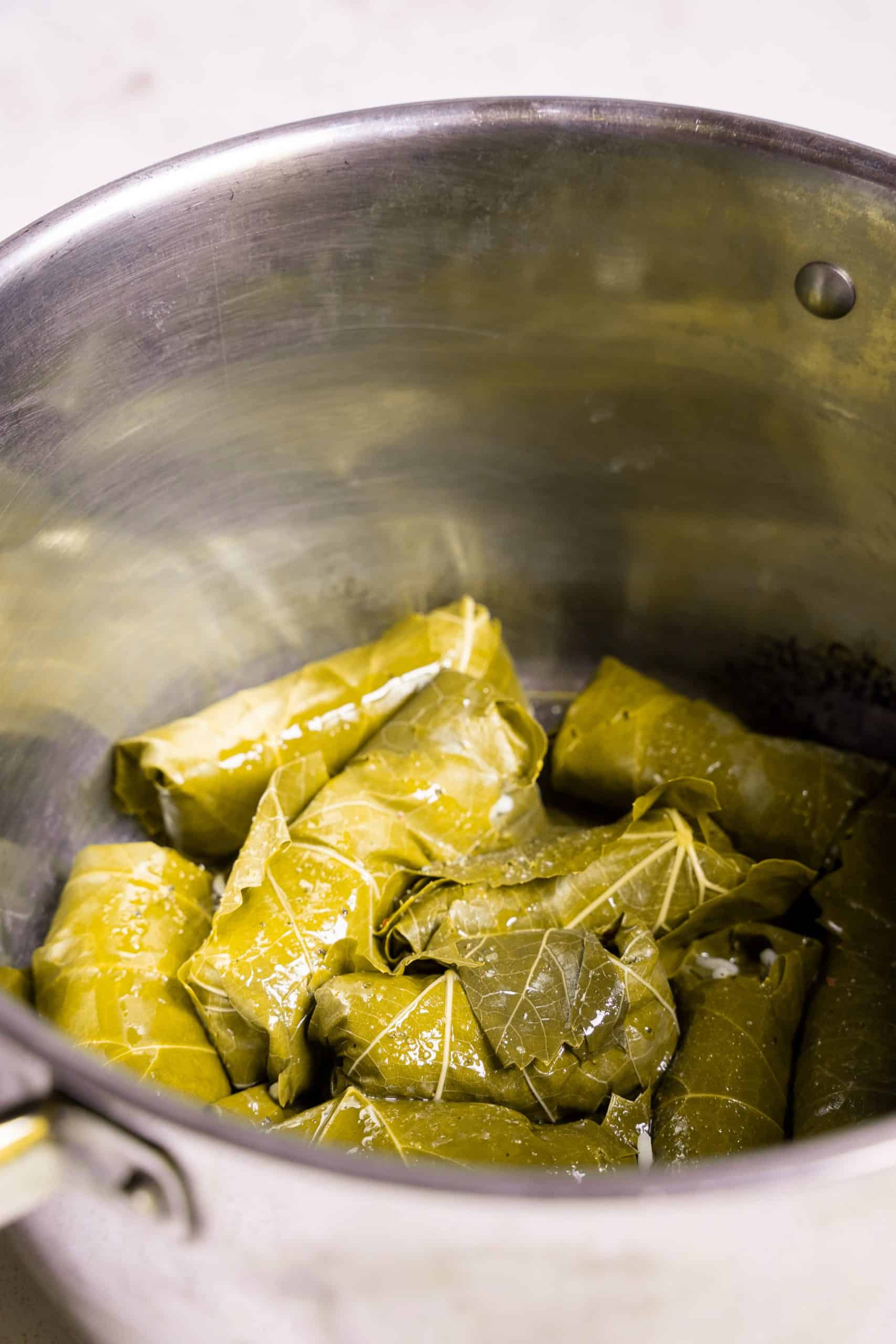 Place the stuffed vine leaves (folded side down) on the bottom of the pot and fill in tightly. When cooking, avoid leaving any gaps between the dolmades to avoid them from cracking open.