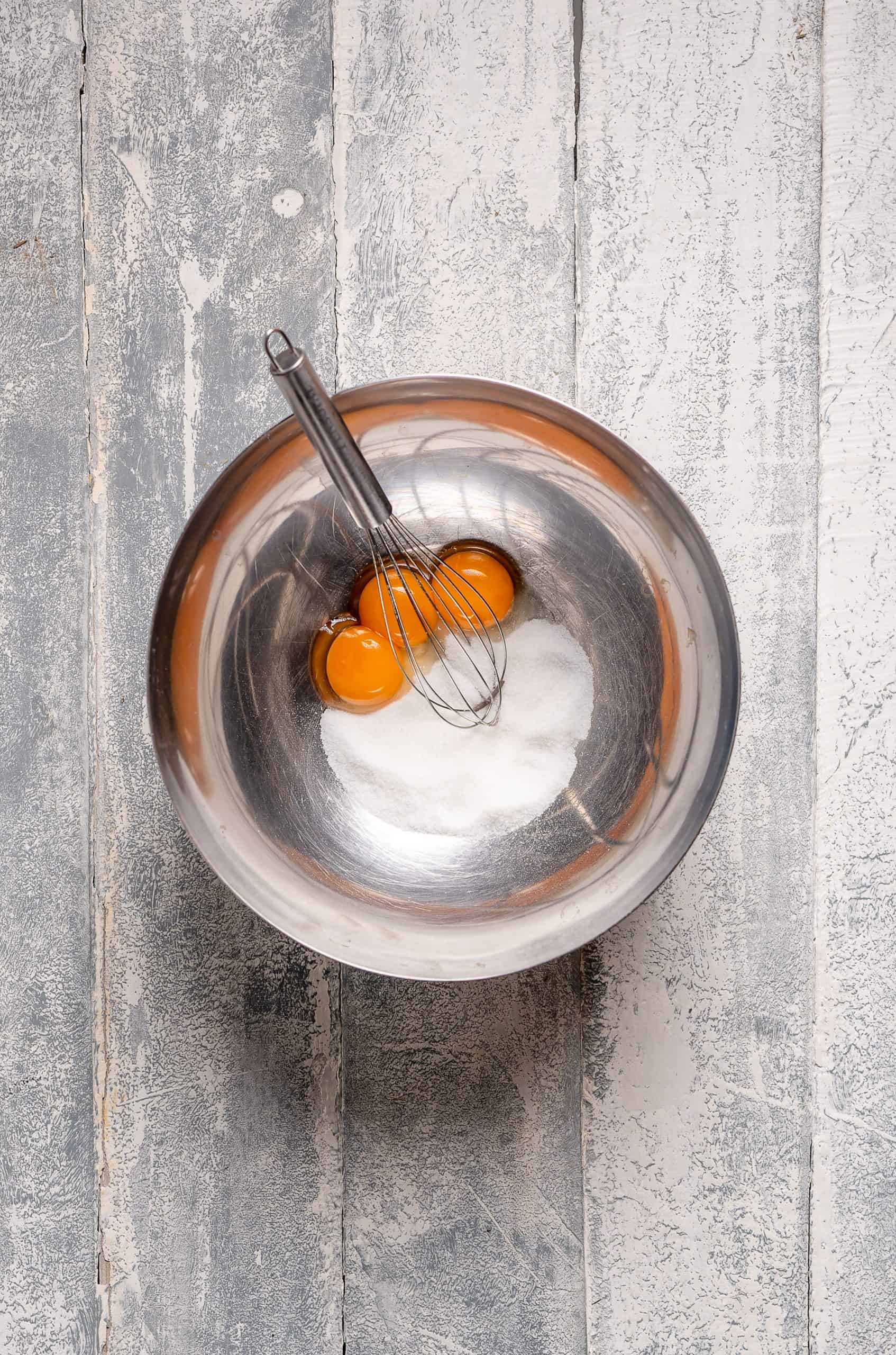 - In the meantime prepare the custard for the ekmek kataifi (steps 2-4). Add in a large bowl the egg yolks with half the sugar (100g) and whisk until fluffy. Add 3-4 tbsps of the milk and the corn starch and whisk again until the corn starch has dissolved. Set aside.