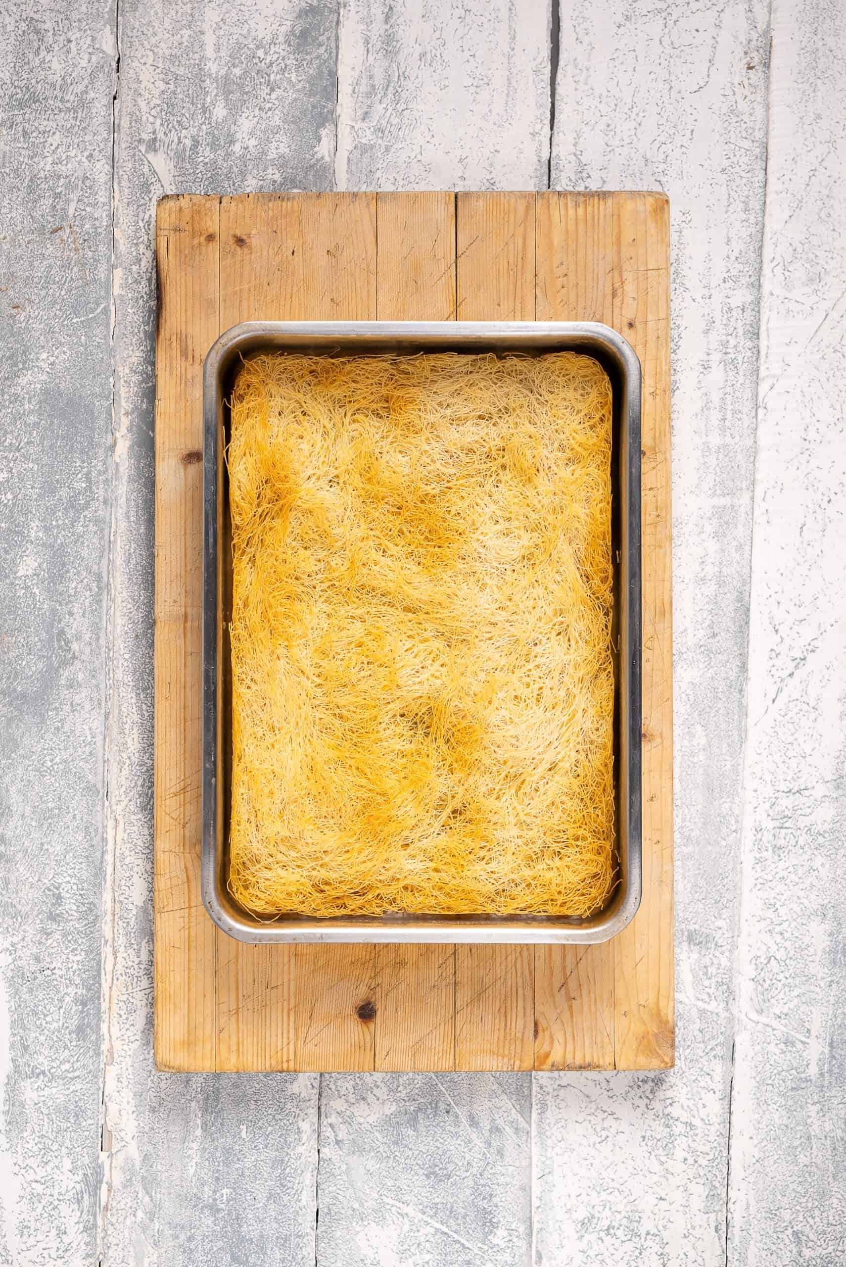 - To prepare this traditional Ekmek kataifi recipe start by making the base. Preheat the oven to 170C and unroll the kataifi dough from the plastic sleeve. Work the kataifi dough with your hands, tearing apart the shreds and spreading the strands out a bit if they clump together, in order to get fluffy. For this ekmek kataifi recipe you will need a 25cm square non-sticking baking dish. Butter the bottom of the baking dish and spread the kataifi dough to form the base of the ekmek kataifi. Pour over the melted butter and bake in preheated oven for 30-45 minutes depending on your oven, until crispy and nicely coloured.