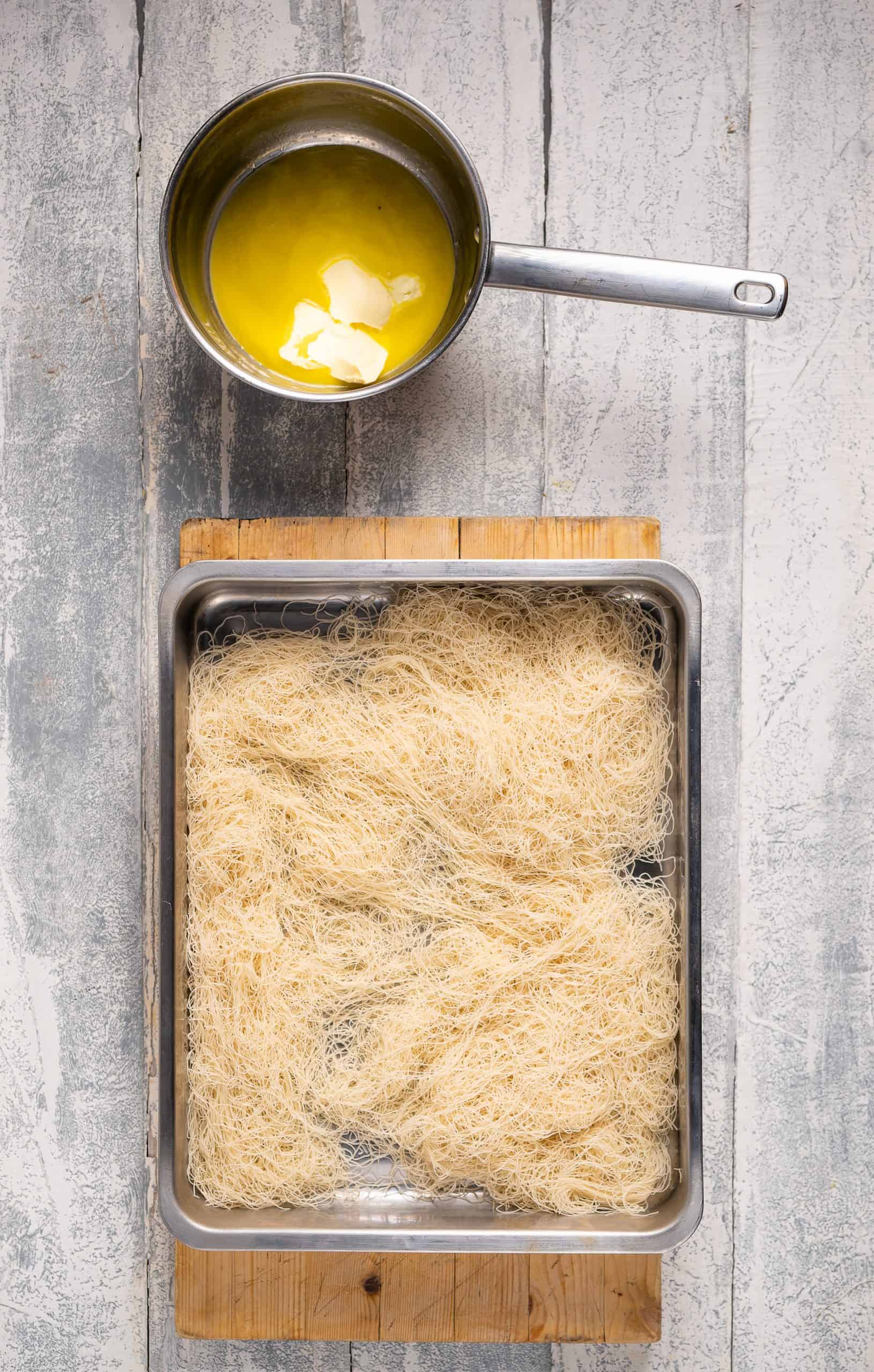 The key for the most flavorful homemade Ekmek Kataifi is to use good quality fresh butter for buttering. The authentic Greek ekmek kataifi recipe calls for ‘galaktos’ butter made from cow’s milk, which really gives a unique flavour and amazing smell!