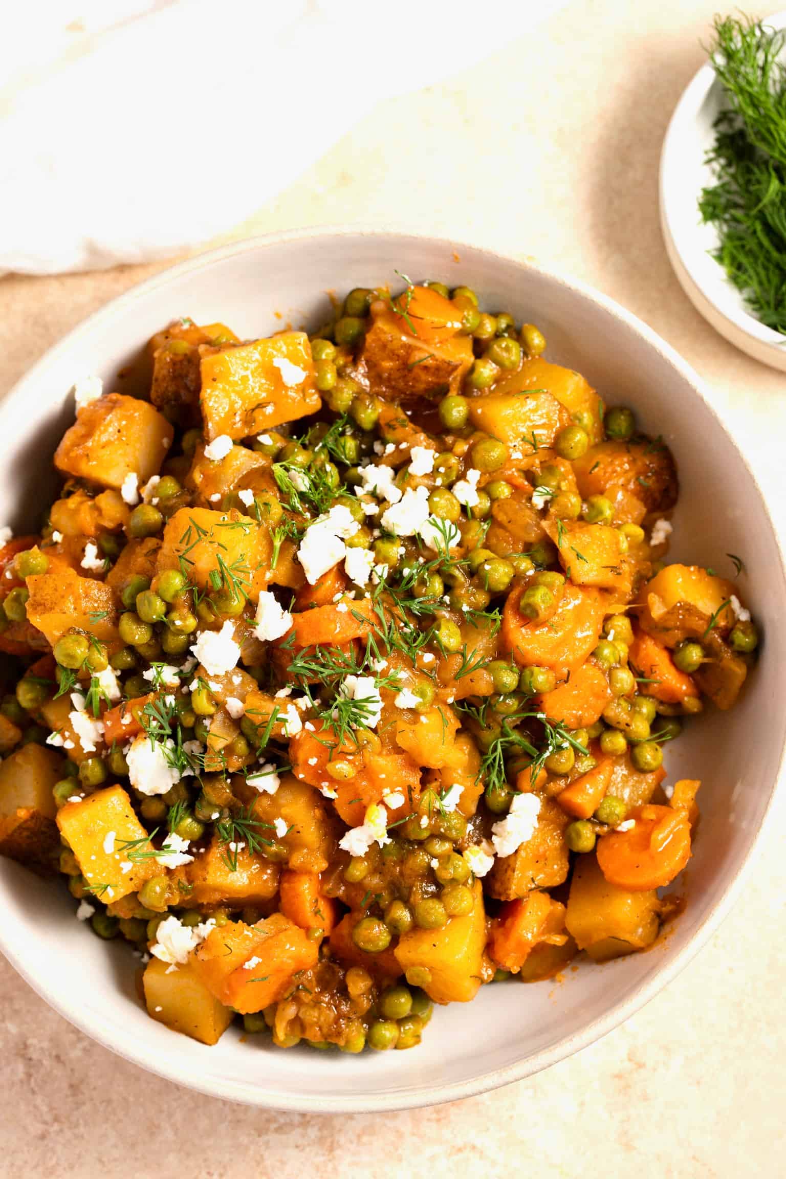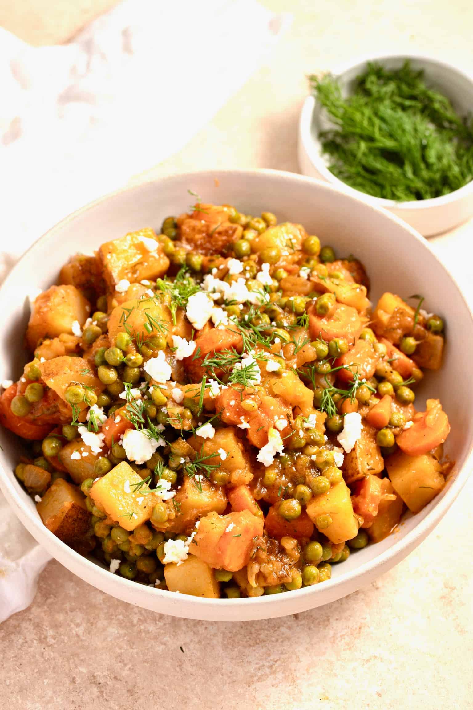 Enjoy this simply delicious, extra comforting Greek peas and potato stew (arakas laderos) with crumbled feta cheese on top and crusty bread to mop up every single drop of that delicious sauce!
