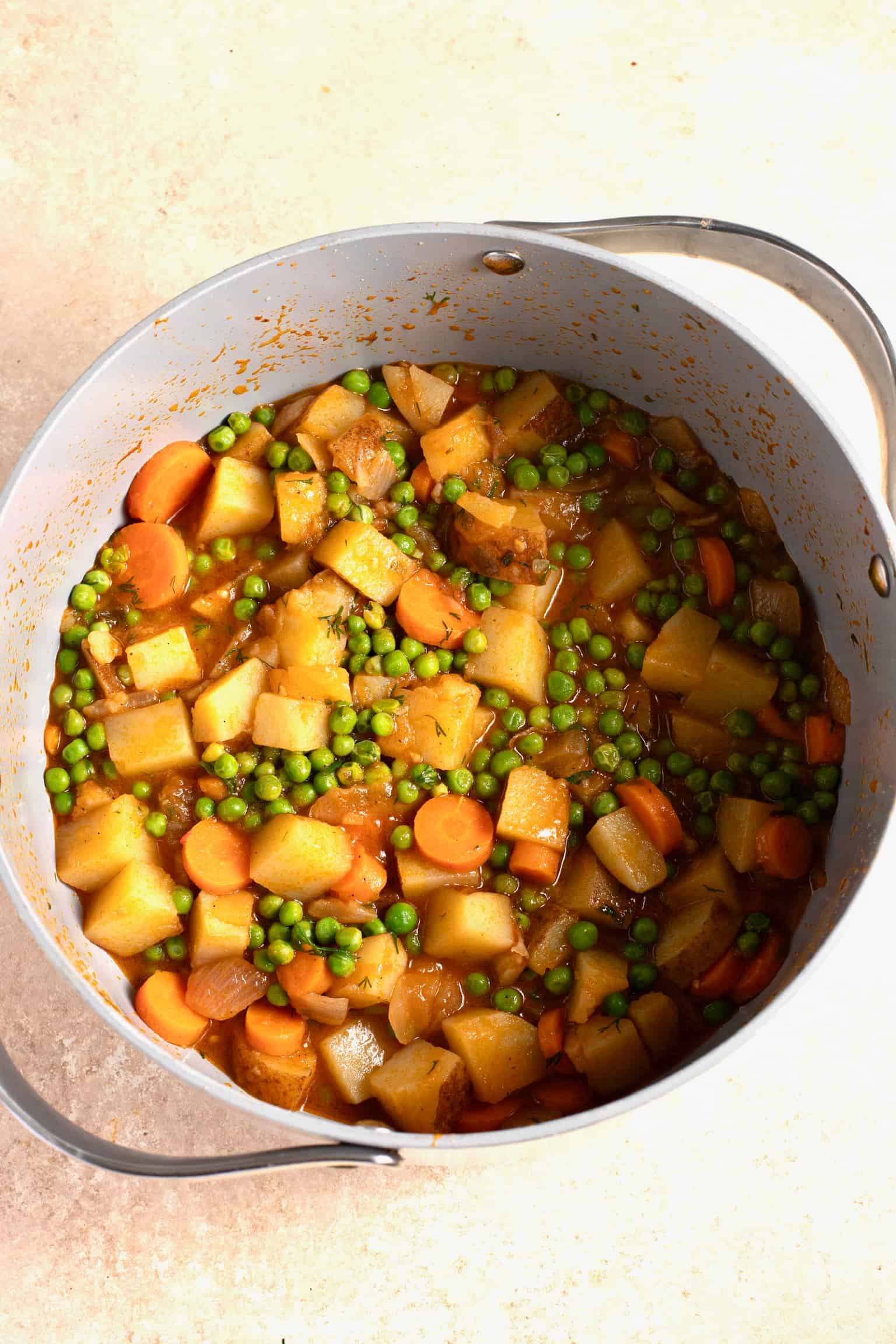 One can find many variations of this traditional Greek dish, with the most popular being this classic version of peas and potato stew with carrots in a tomato sauce.