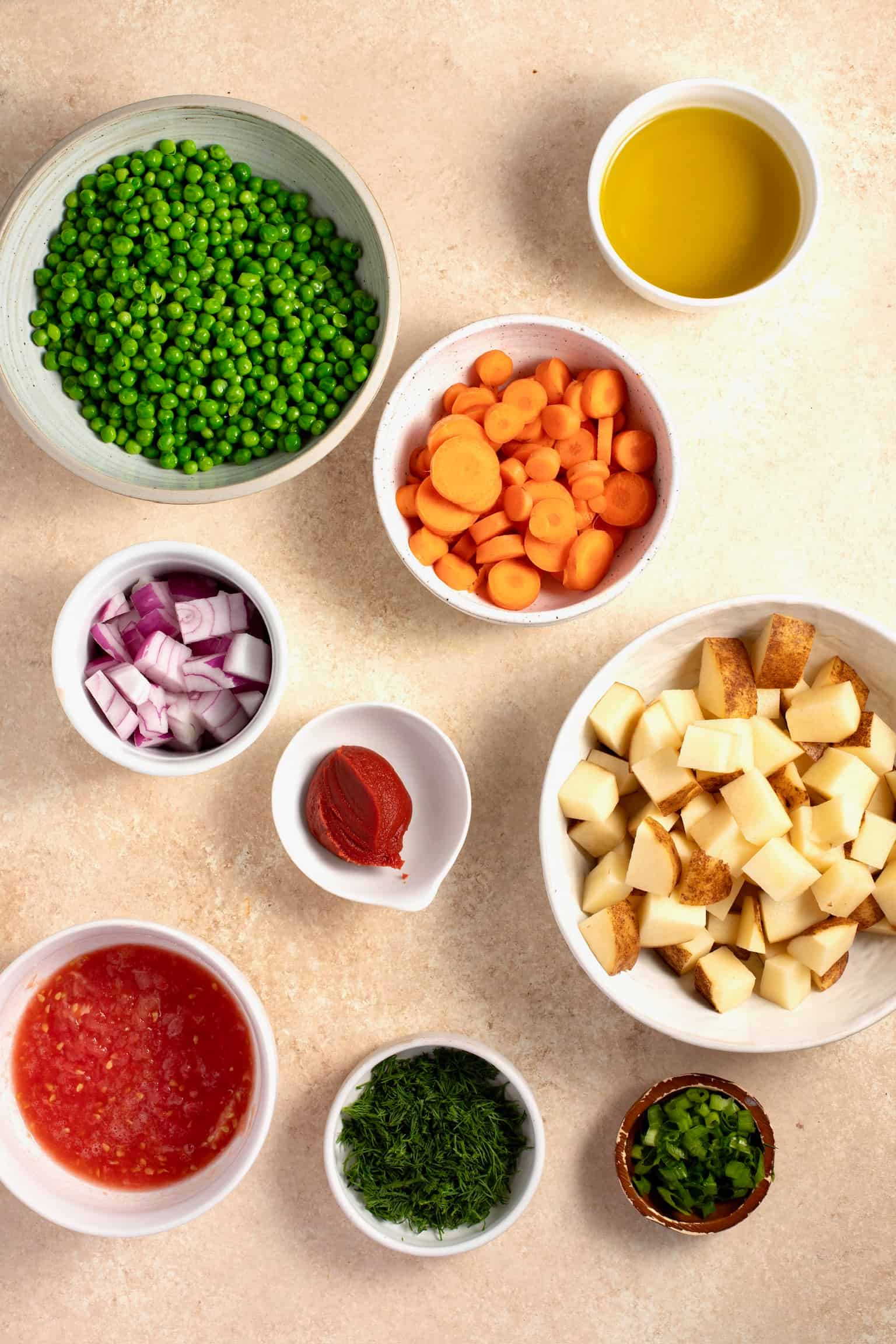 Ingredients for Greek peas and potato stew with tomatoes (Arakas)