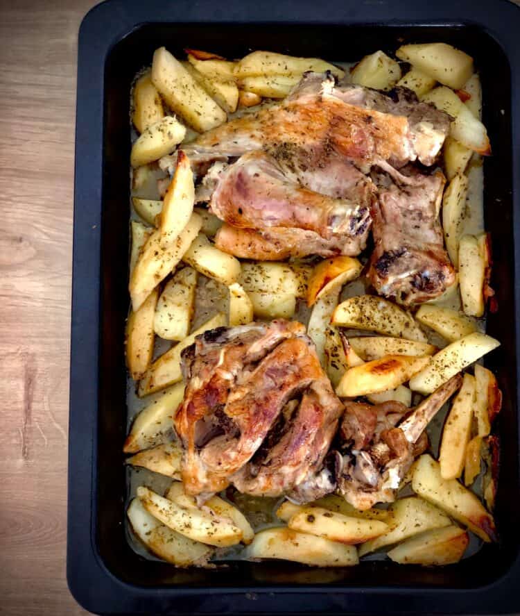 In Greece when preparing Greek roast lamb it is almost a rule to add the potatoes in the same pan with the lamb, so that they get all the juices and aromas from the meat. The main drawback is that the potatoes are not that crispy as when baked on their own. So it’s up to you to decide if you want to sacrifice a little crispiness for extra flavour.