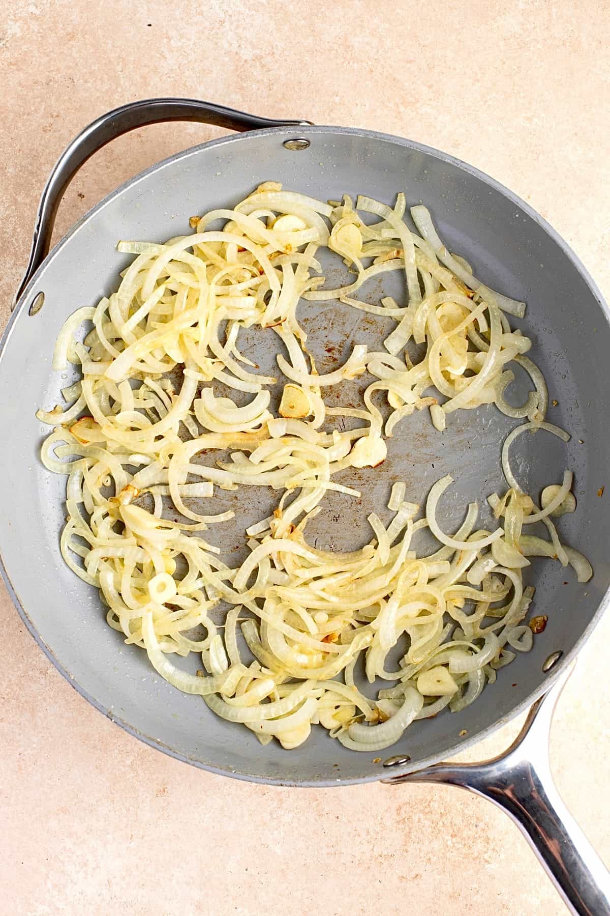 Reduce the heat under the pan to medium and cook the thinly sliced onions with a bit of oil and salt. Cook for 5-6 minutes until soft and starting to change color.