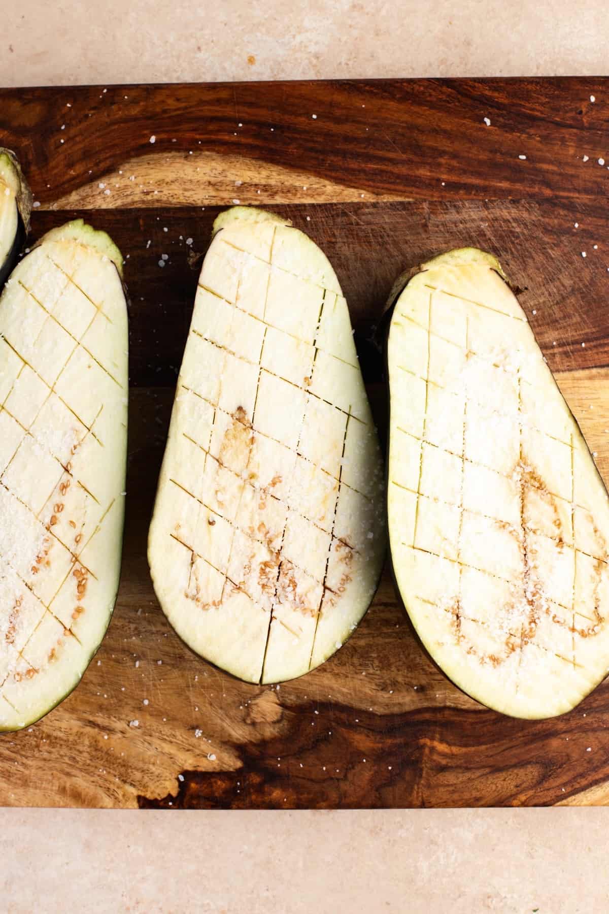 To do this, simply season the eggplant halves with salt and leave them to sit for 30 minutes. This will help to remove any bitterness. Rinse the salt off and squeeze out any excess moisture before proceeding with the recipe.