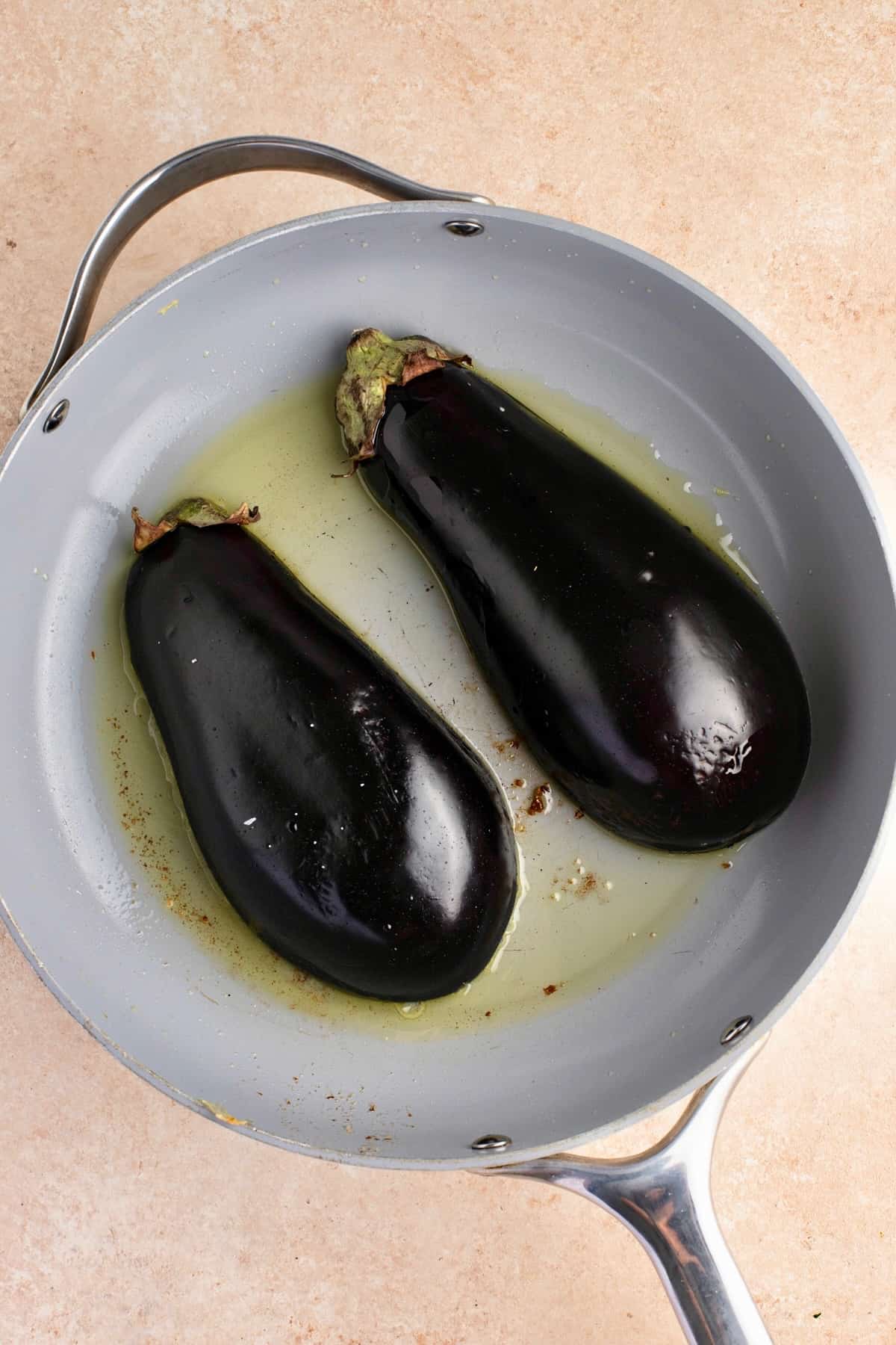 - Measure out the olive oil in a measuring cup or jug, and keep it by the stove. Add a generous splash to a large, non-stick frying pan set over a high heat. Fry the eggplant, working in batches and adding a little more oil if necessary until their exposed flesh is golden. As you remove them from a pan, nestle them cut side up in a baking dish just large enough to fit them snugly.