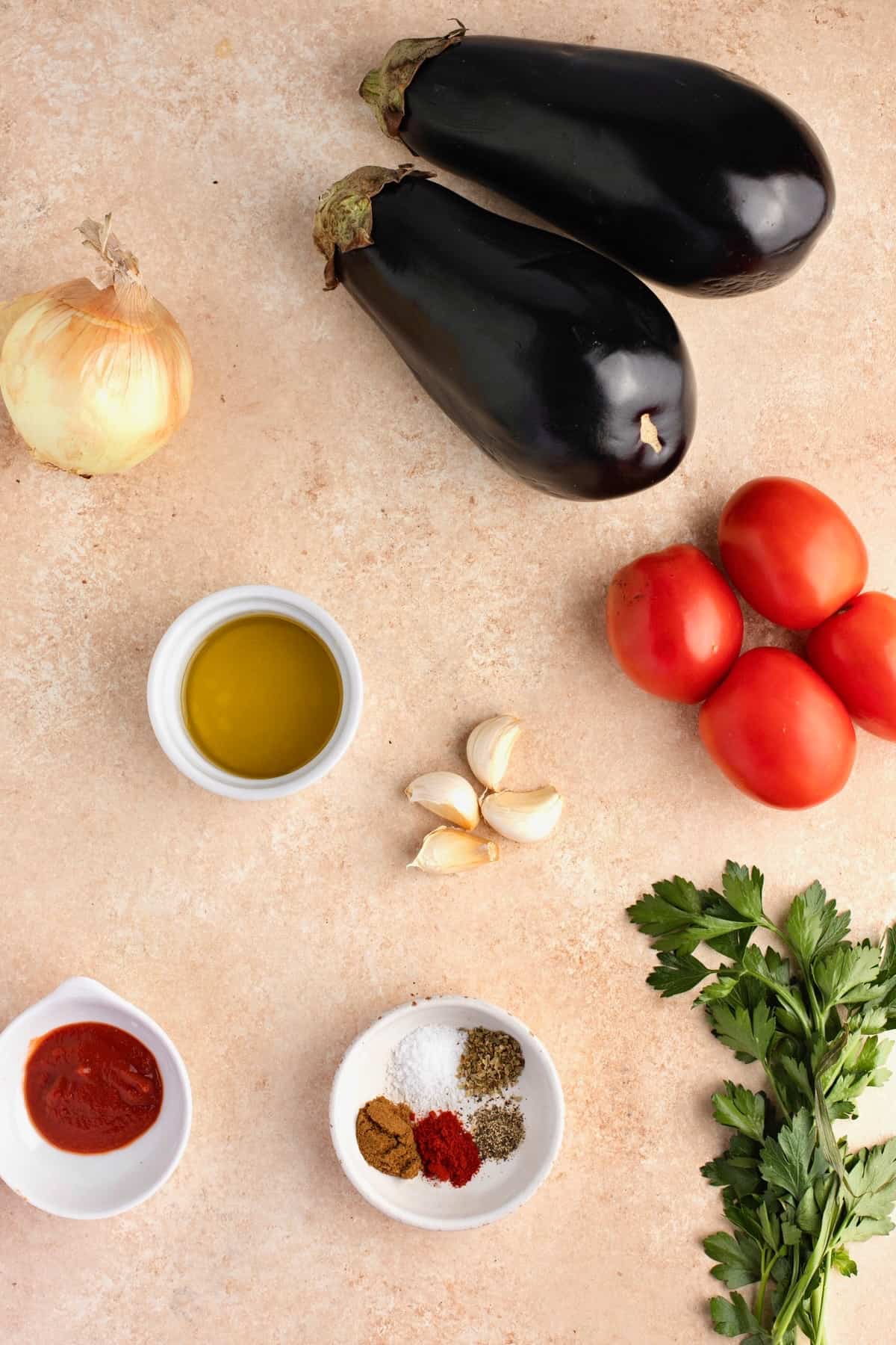 Basics: For this imam Bayildi recipe, you will want 1 large eggplant per 2 portions you want to create. You’ll also want onion and garlic cloves along with plum tomatoes for the basics of the dish.