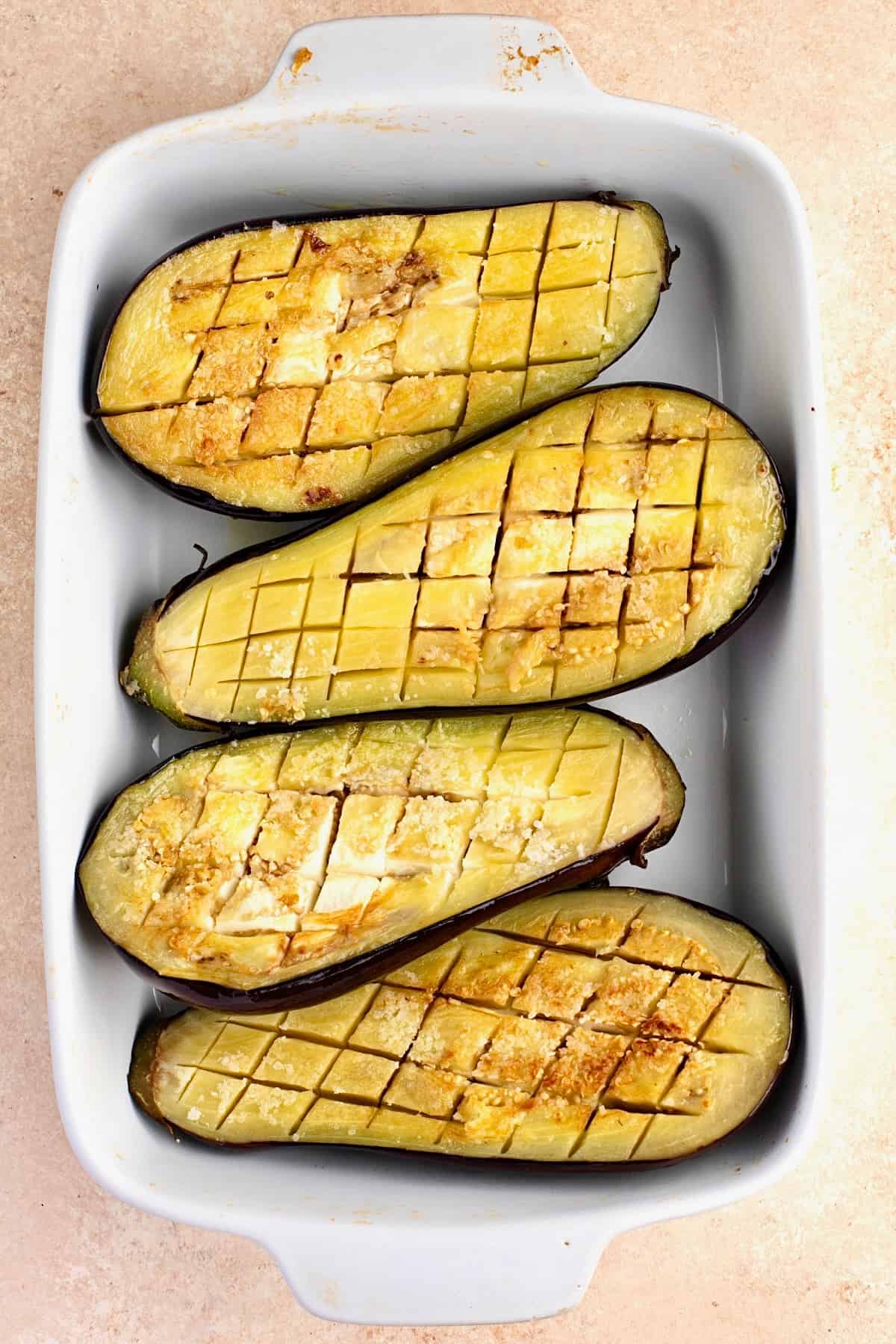 In some cases it may take a bit longer to cook, depending on how big your aubergine is and how thick its scored, but if you’re in a hurry you could score deeper and more frequently, allowing for more surface area to cook it through.