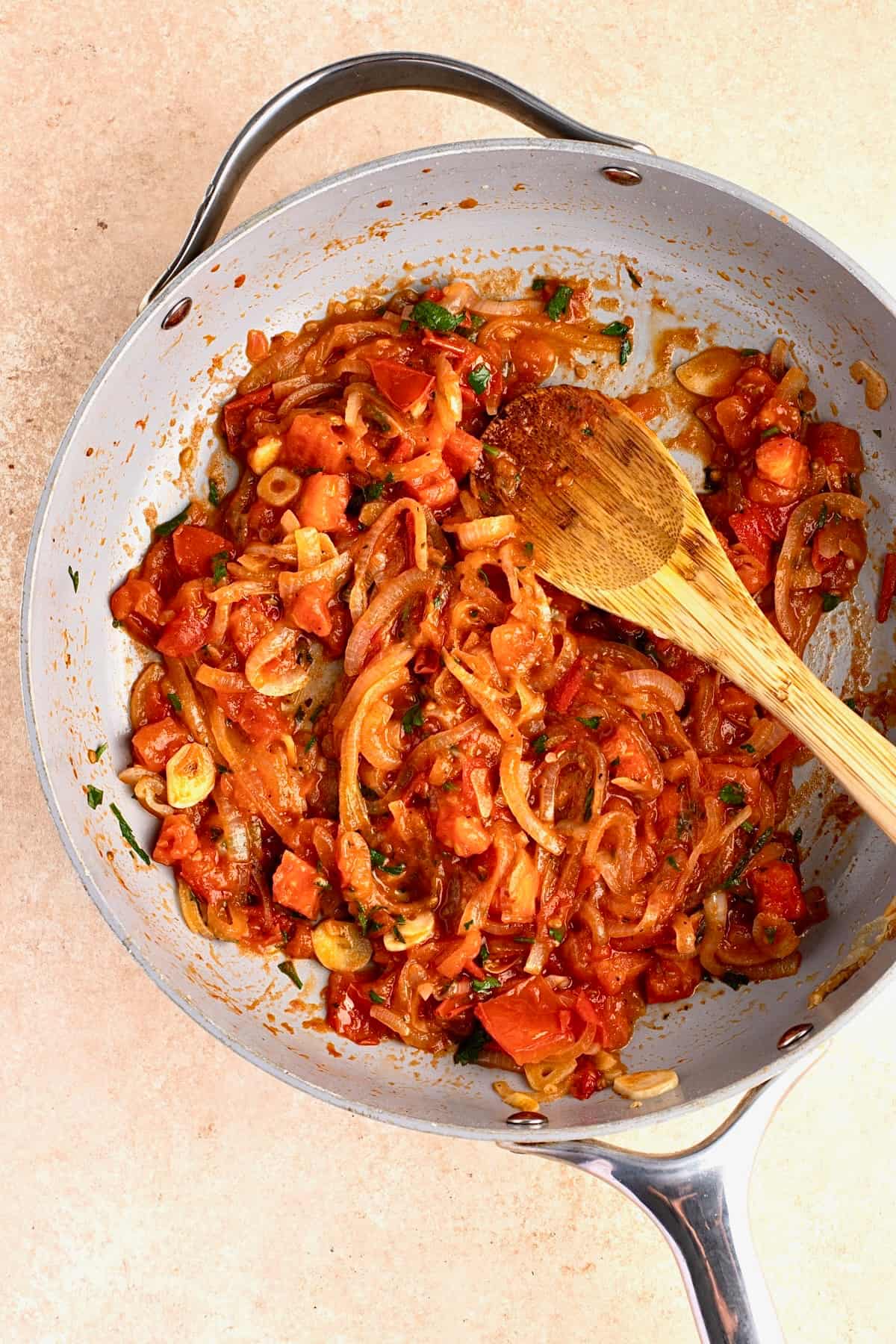Roughly dice the tomatoes and add them to the pan, cooking for another 5 minutes until breaking down into a rough sauce.