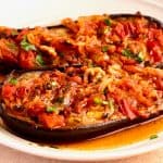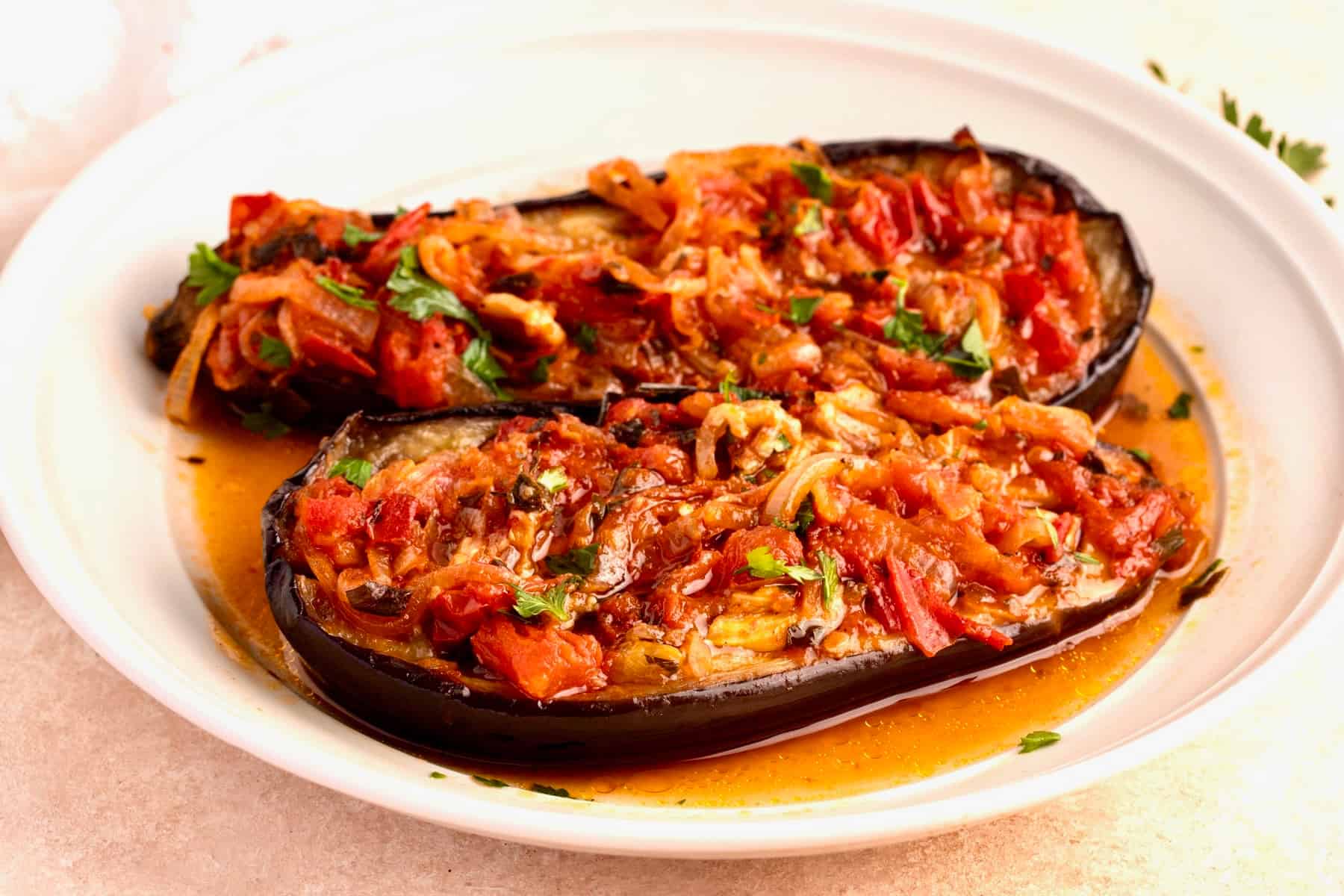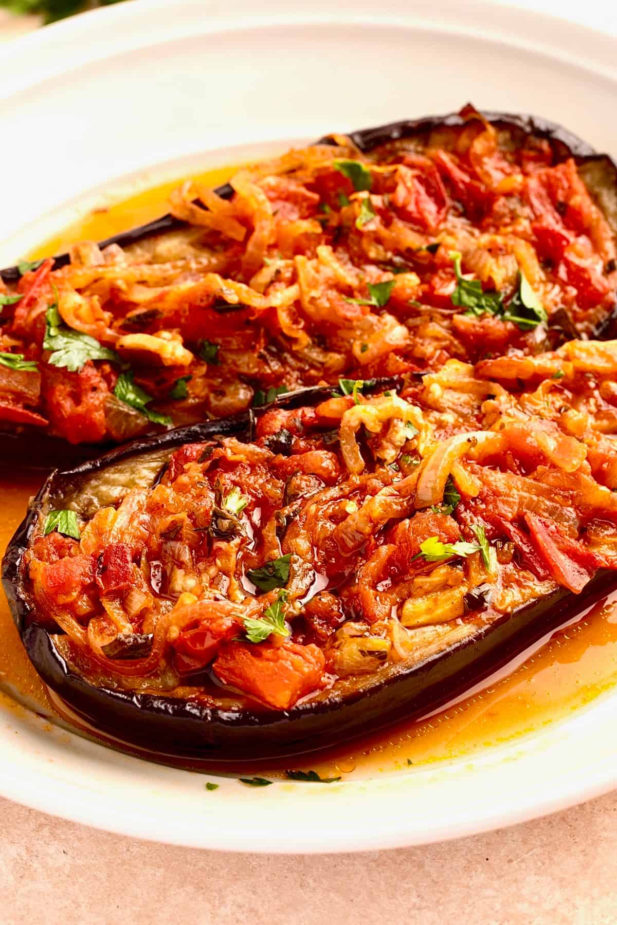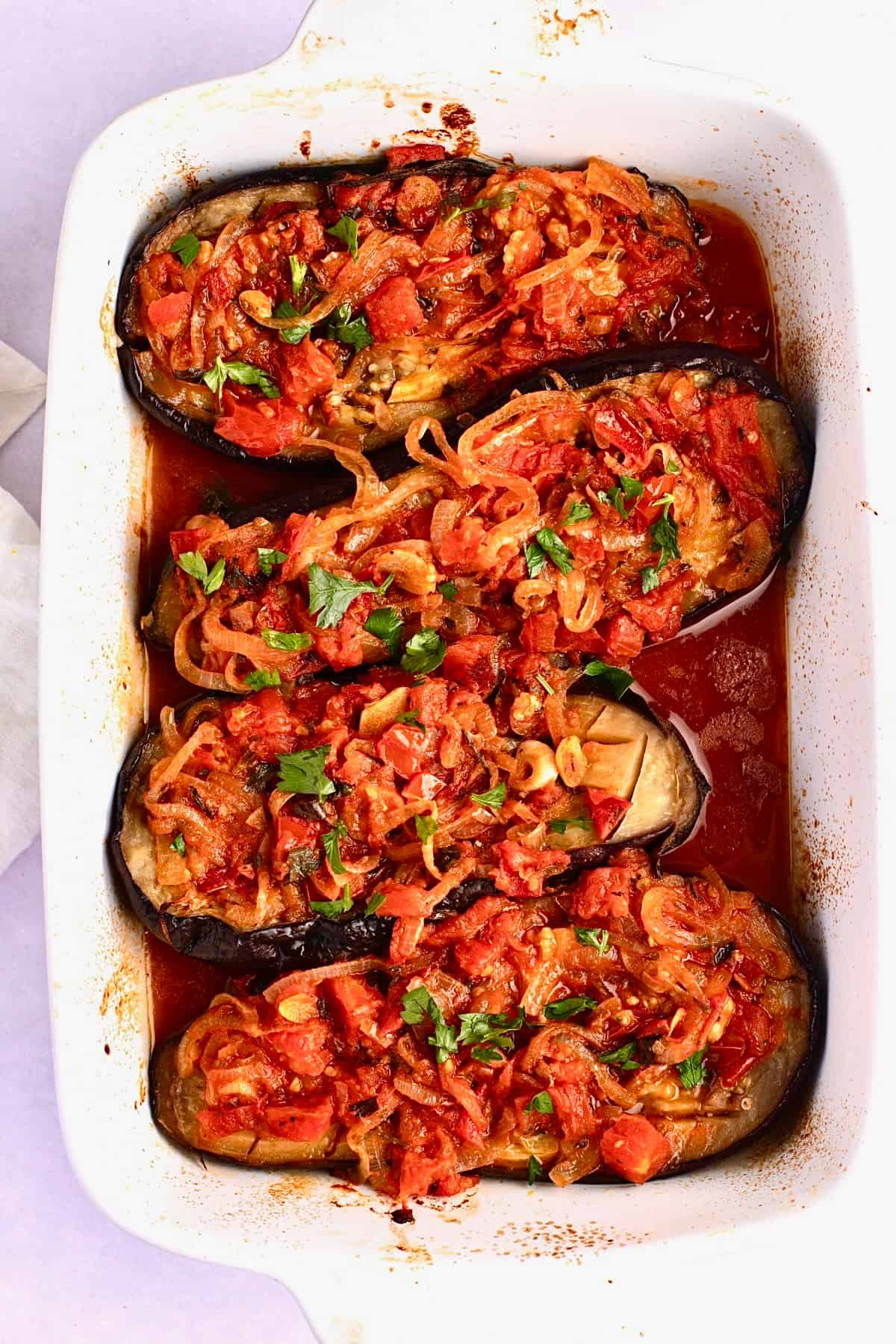 Imam Bayildi (stuffed eggplants) is a simple, delicious vegan dish, packed with so much flavor! An amazing combination of fresh aubergines stuffed with a juicy tomato based filling, caramelised onions, garlic with aromatic herbs and spices!