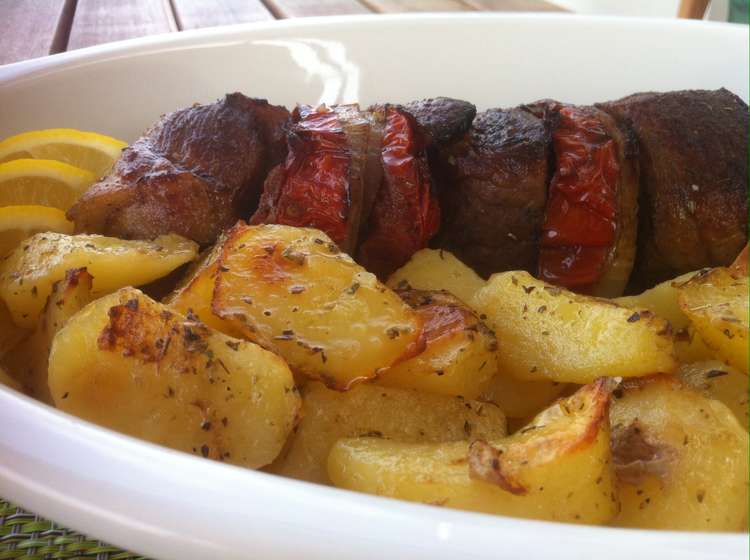 - Place the kontosouvli on a large baking tray and add the potatoes, cut into wedges and season them with salt and pepper. Add 4 tbsps olive oil, 1/2 glass of water and sprinkle with a good pinch of oregano.