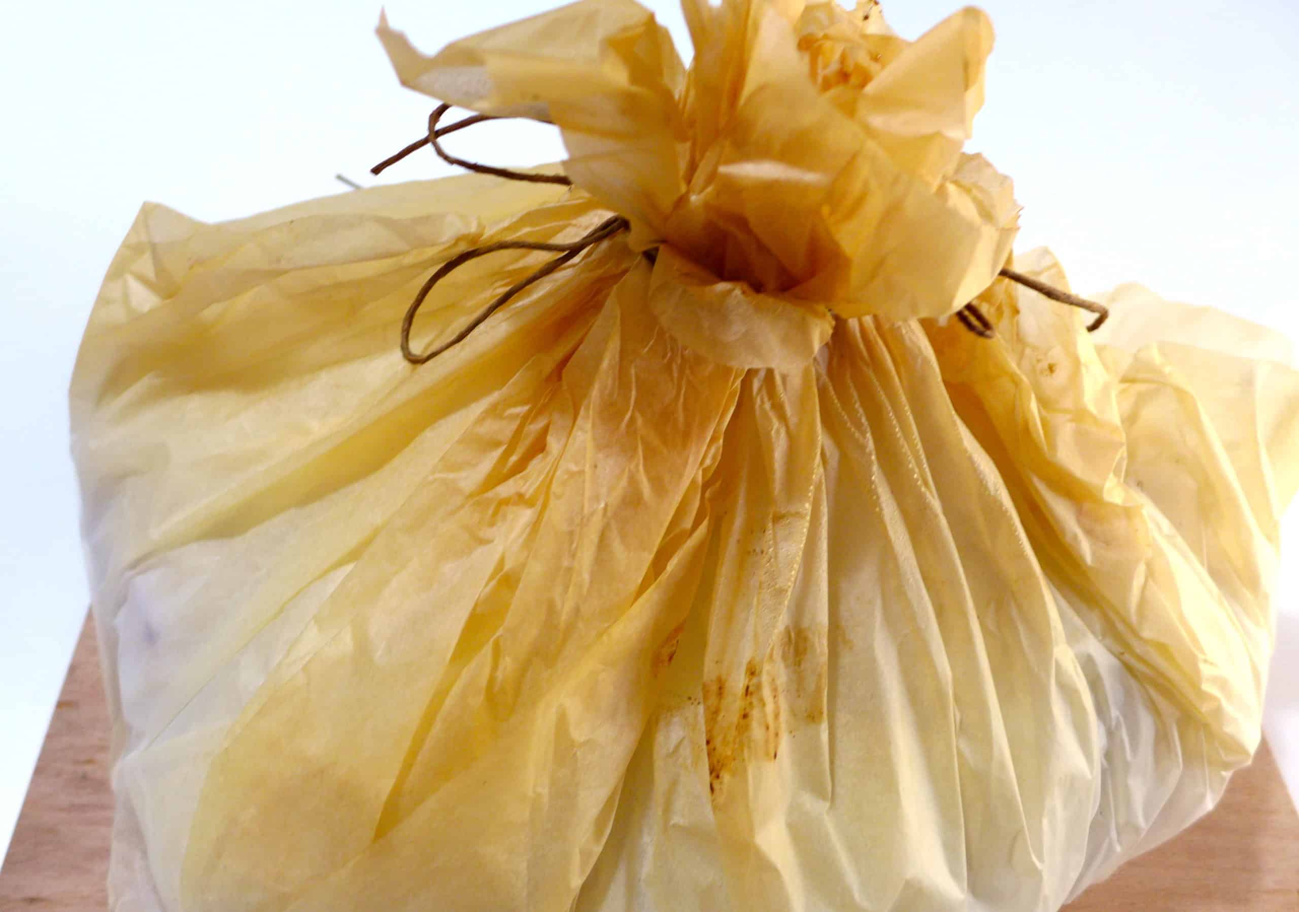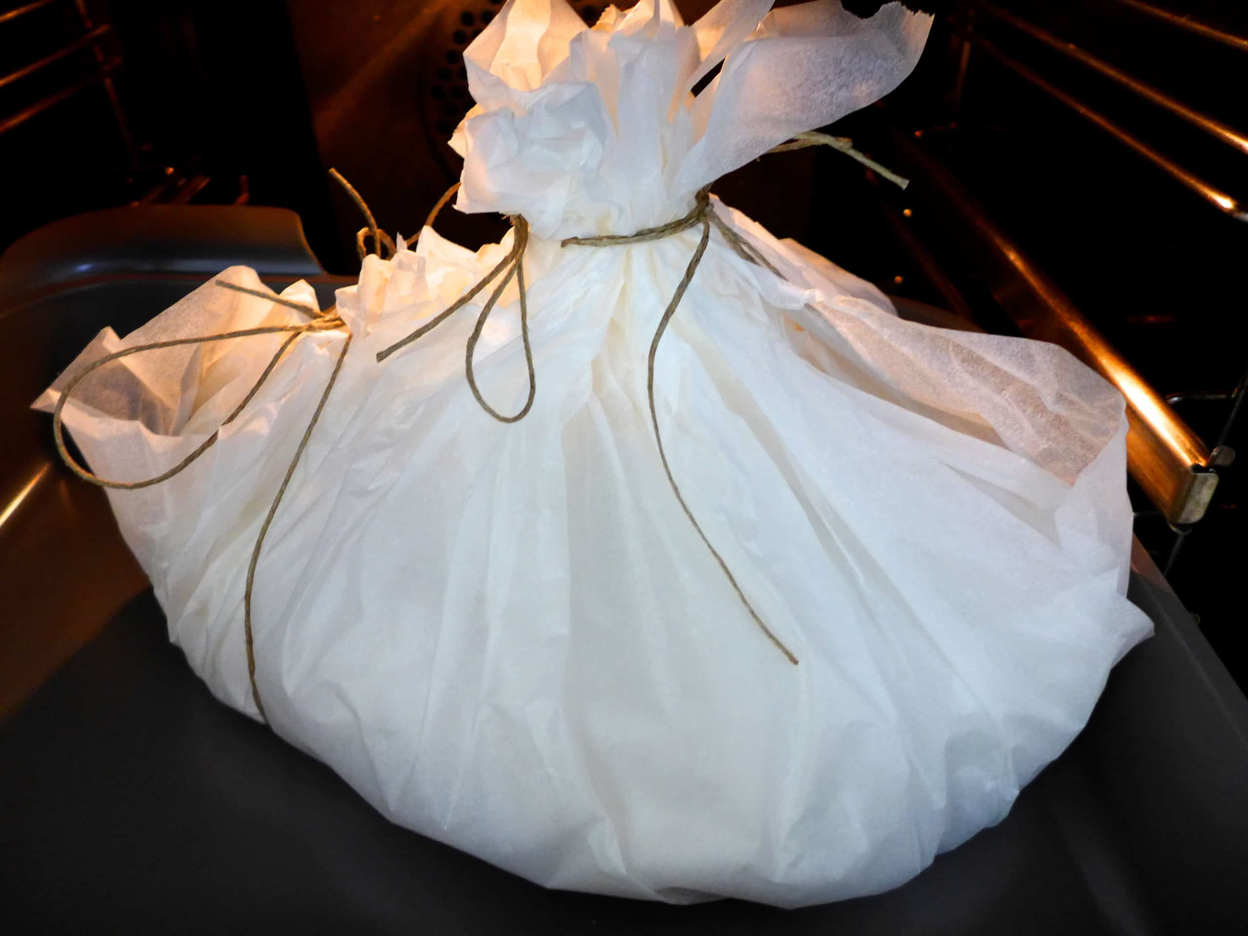 - Now it’s time to wrap the lamb kleftiko in parchment paper. Lay 4 long pieces of parchment paper to form a star. Pop the potatoes in the centre of the parchment paper and season with salt and a pinch of oregano. Pour the marinade from the lamb over the potatoes and set the lamb and vegetables on top of the potatoes. Layer with the sliced tomato and enclose the lamb kleftiko into a pouch. To enclose the lamb kleftiko hold the parchment paper from the edges, crosswise and grab with your hand in the middle, just above the stuffing and squeeze. Use the kitchen string to tie tightly the whole thing together, just above the stuffing and lift into a roasting tin.