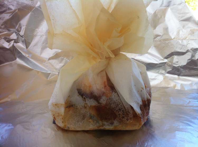 - Place the pouches into a baking tray, and bake in a preheated oven at 180C for 85-90 minutes. Cut the kitchen strings and serve as it is.