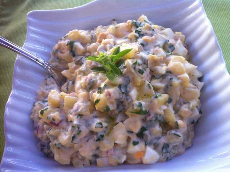 For a more rustic patatosalata add potatoes in quarters or big chunks, red thin sliced onion, parsley, fresh dill, dry oregano and optional black or whatever olives.And from dressing drizzel the salad with red wine vinegar and lots of olive oil