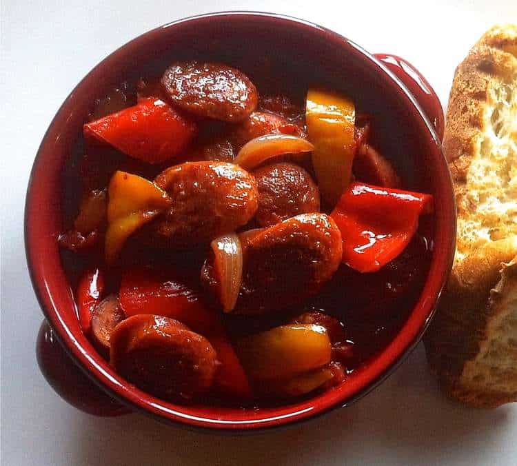 A rustic spicy Greek dish made with thick country sausages and peppers in a rich tomato sauce.. Perfect over a glass of red wine or tsipouro! Paired with salty kefalotyri cheese or tangy feta, lots of crusty bread, to dig in all the delicious sauce, it is guaranteed to warm you up during the cold winter’s days.
