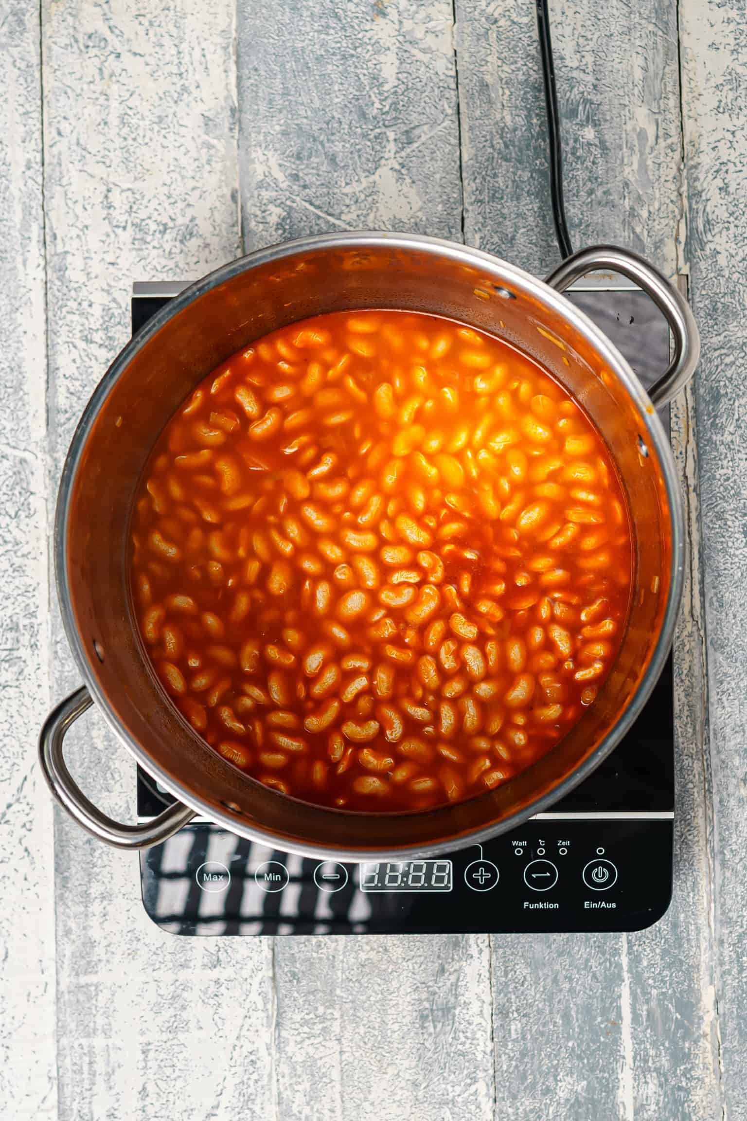 Add the parboiled beans to the pan and enough boiling water to cover them with a little extra, then blend lightly. Simmer for about 35 minutes until the beans are soft, adding the lid halfway through cooking.