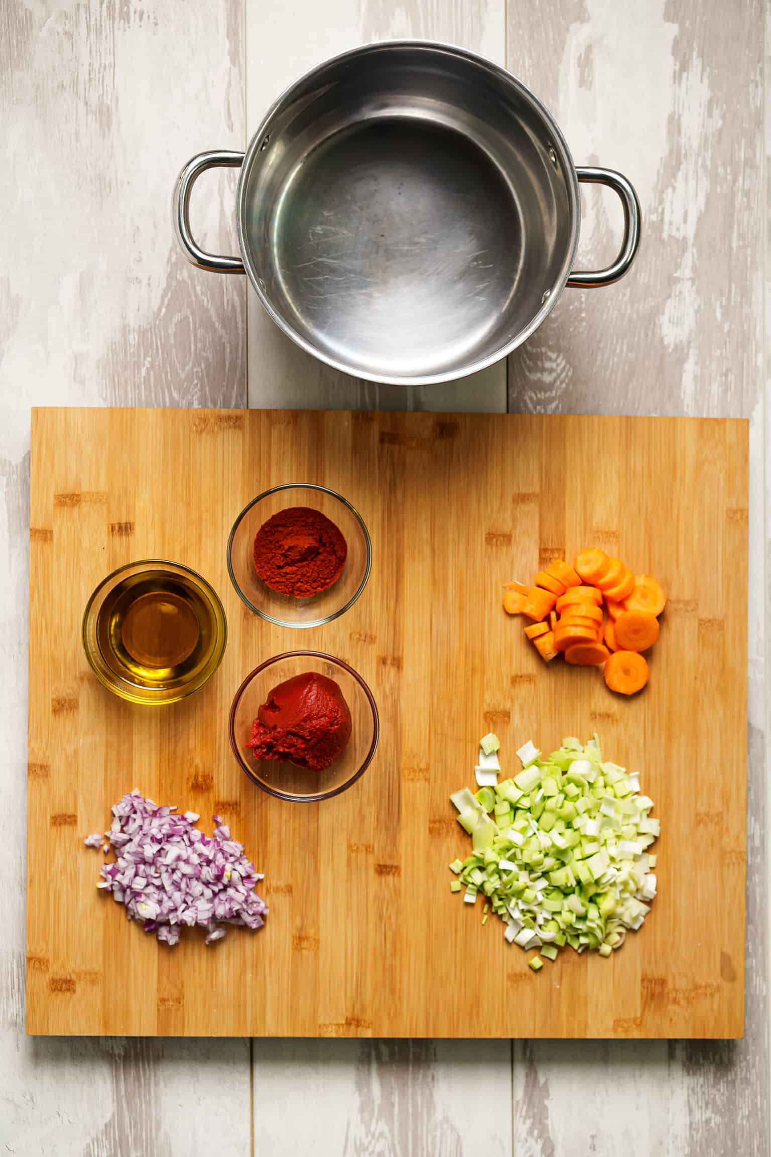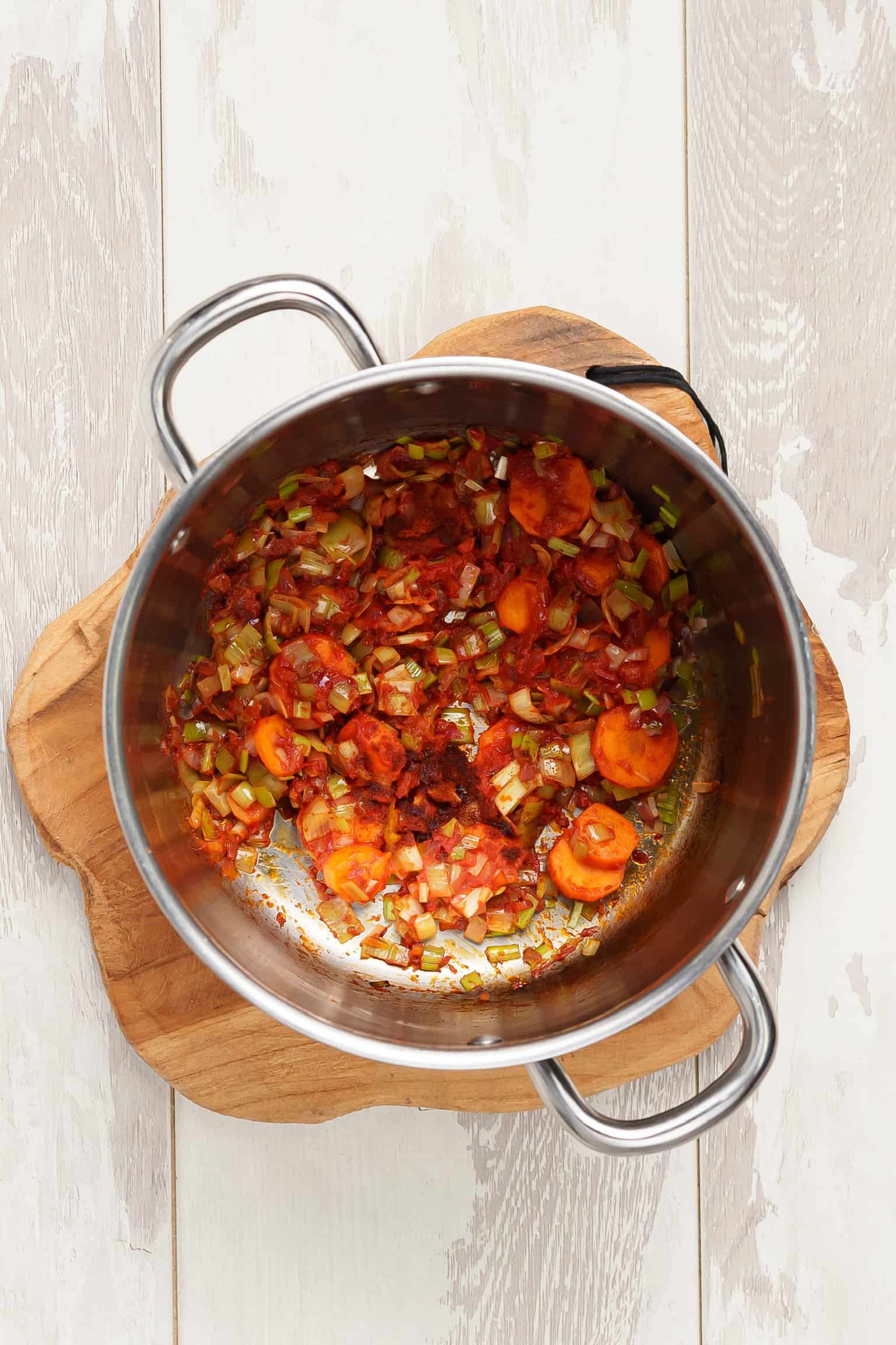 Cut the onion, celery, and carrots into small pieces. In a large pan, add 3-4 tbsp of olive oil and chopped vegetables. Sauté for about 2 minutes before adding the tomatoes paste and cooking for another minute.