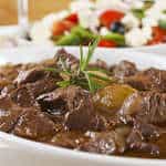 For juicier results, the key is to pick the right kind of meat. For a Greek beef stew, you need to choose large cuts of meat from either the front shoulder or the rear end of beef, which, when cooked for a long time, become fork tender. Serve with a drizzle of extra virgin olive oil, mashed potatoes or basmati rice and enjoy over a glass of your best white wine!