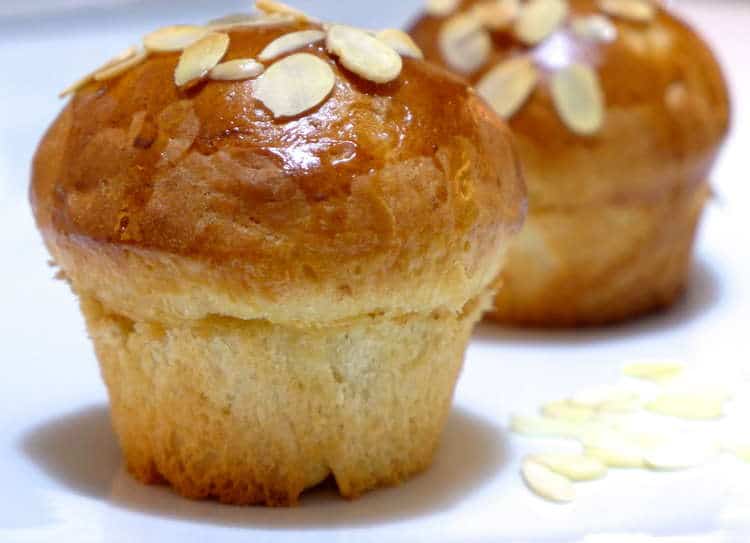 - In a small bowl add the egg and 1 tbsp water and whisk with a fork. Brush the top of each tsoureki muffin with the egg, garnish with almond silvers and bake in preheated oven at 170C for about 20-25 minutes.