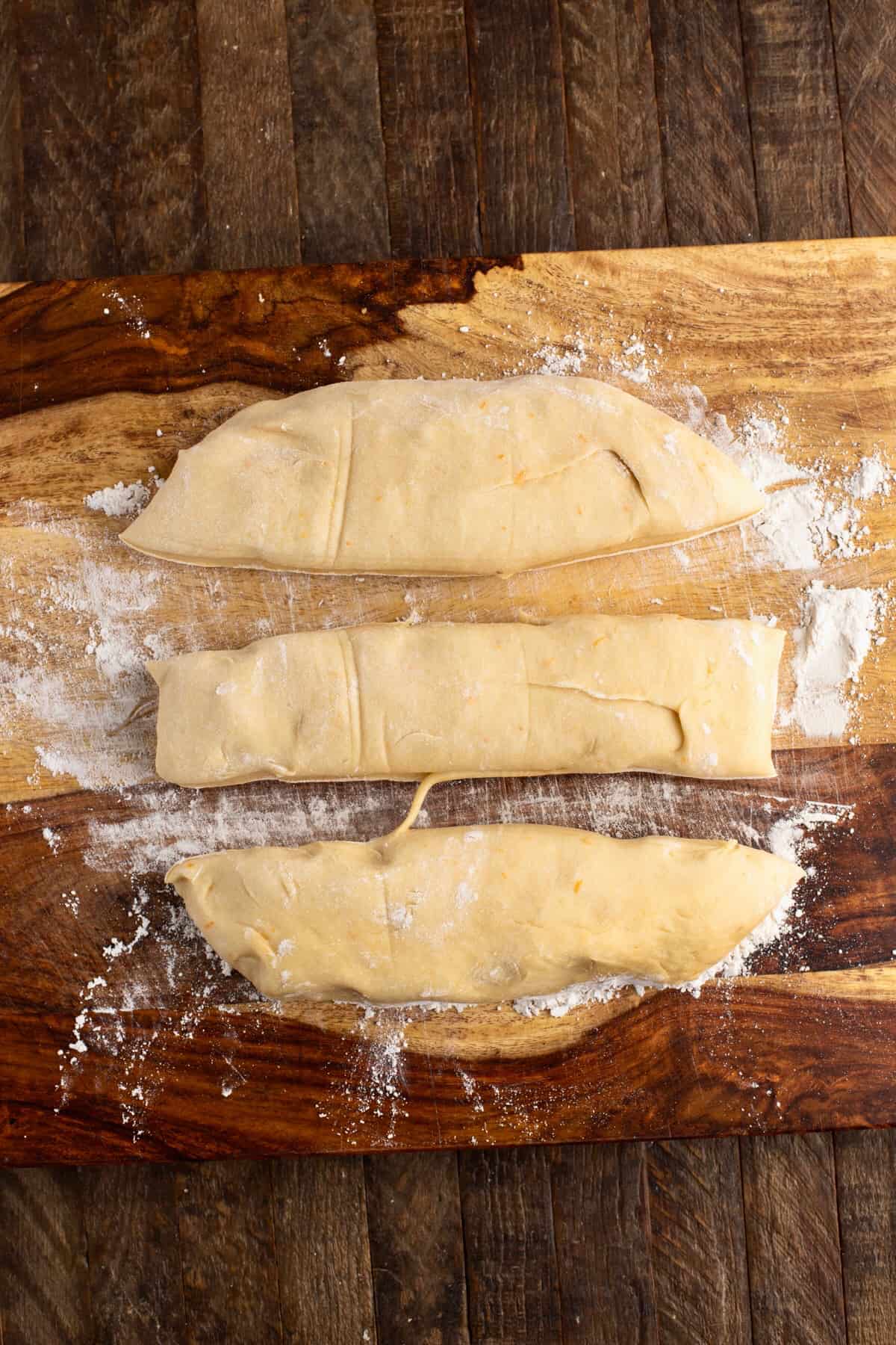 Turn out the dough onto a lightly floured work surface and expel any air bubbles if necessary. Using a knife or a dough scraper, cut the dough into three equal-sized pieces.