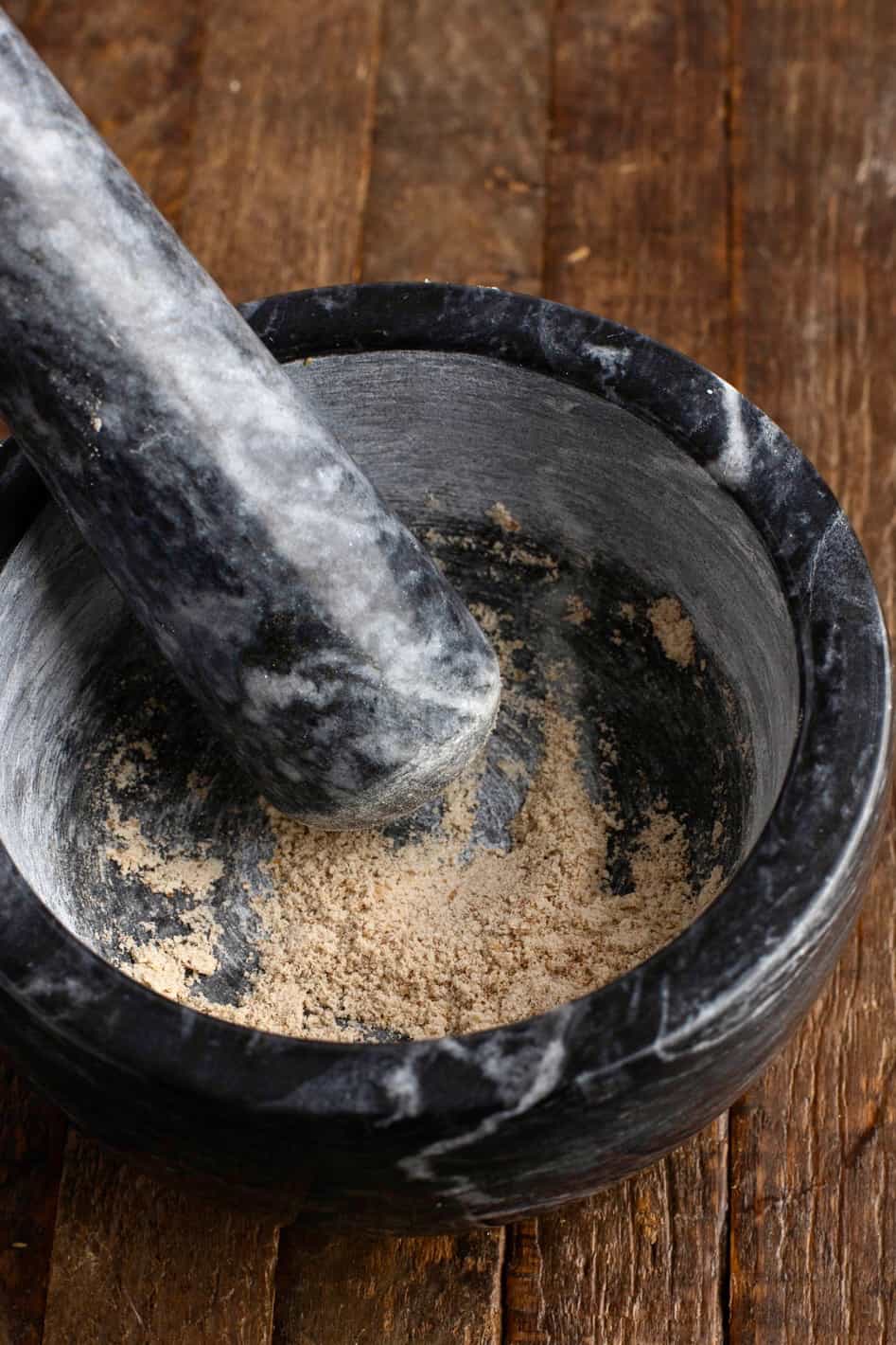 Start by pounding the mastic with a mortar and pestle. Add the mahleb to prevent it from sticking and continue to grind until it’s finely crushed.