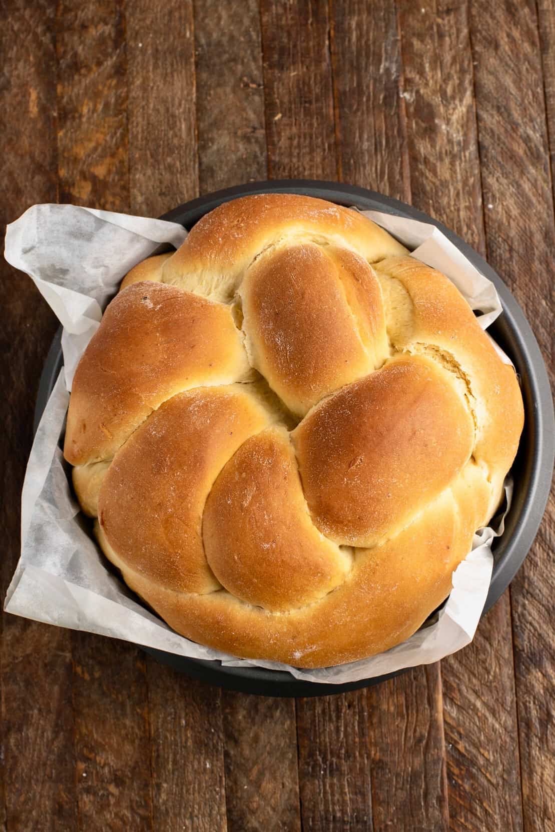 There are two main variations of Vasilopita – the Vasilopita cake version, and the tsoureki dough version, which is this recipe here, kind of the same as an easter Tsoureki but rather shaped in a tin! Tsoureki is typically made with a brioche-like dough.