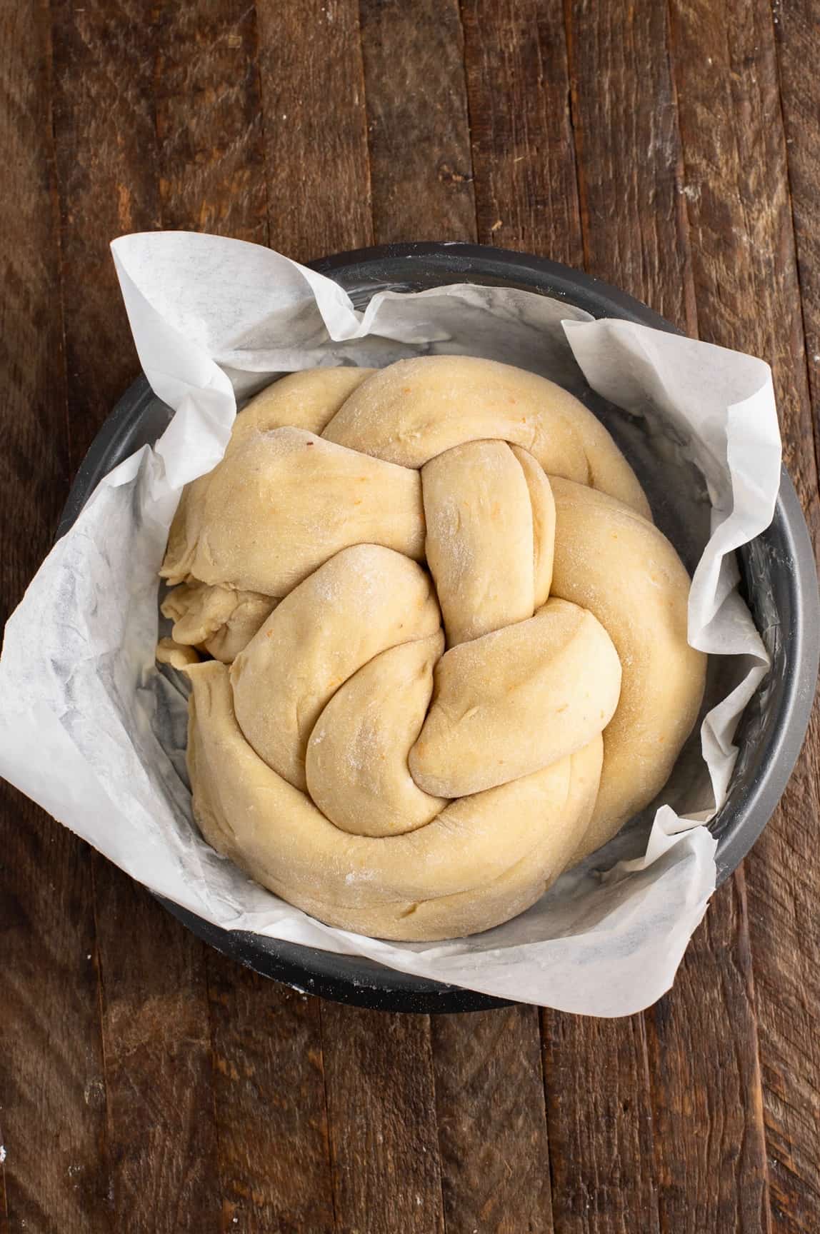 After braiding, transfer the dough to a prepared tin and let it rise for another two hours.
