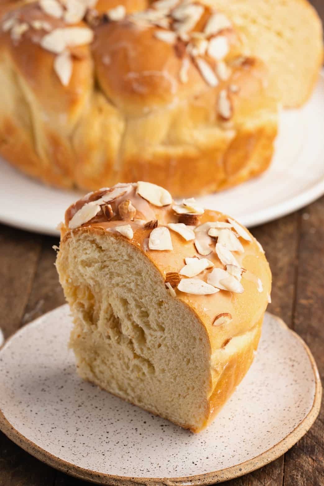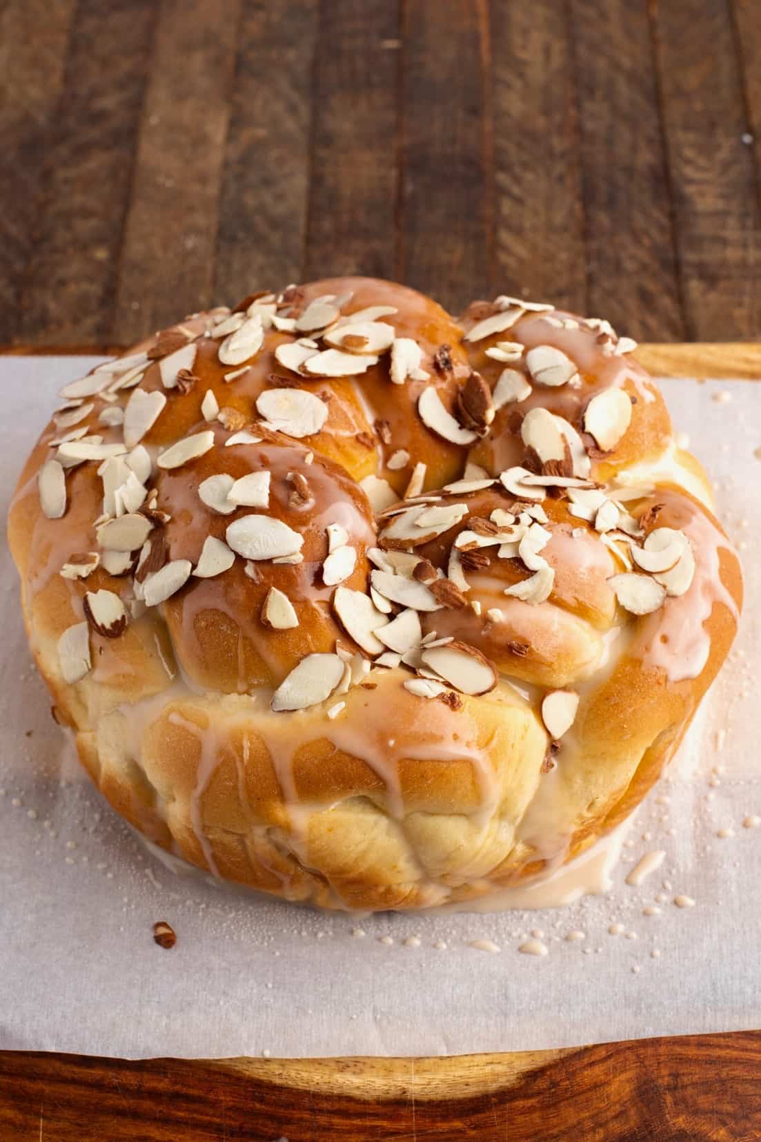 For the glaze: This is made with water, powdered sugar, vanilla extract and flaked almonds.