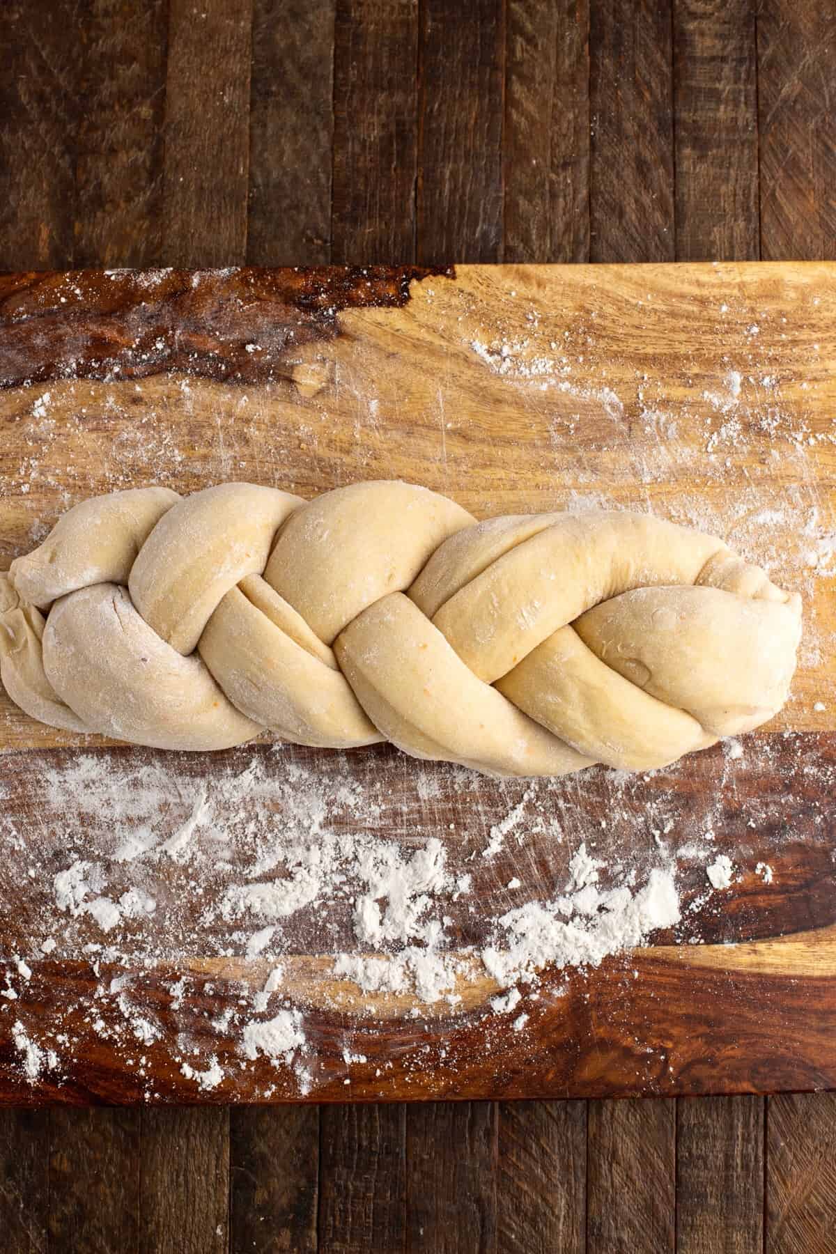 Be sure to not leave any air pockets between the strand, but also don’t stretch the dough too much as you braid it. Once you’ve finished braiding, shape it into a coil and tuck the ends underneath so it’s tidy looking.