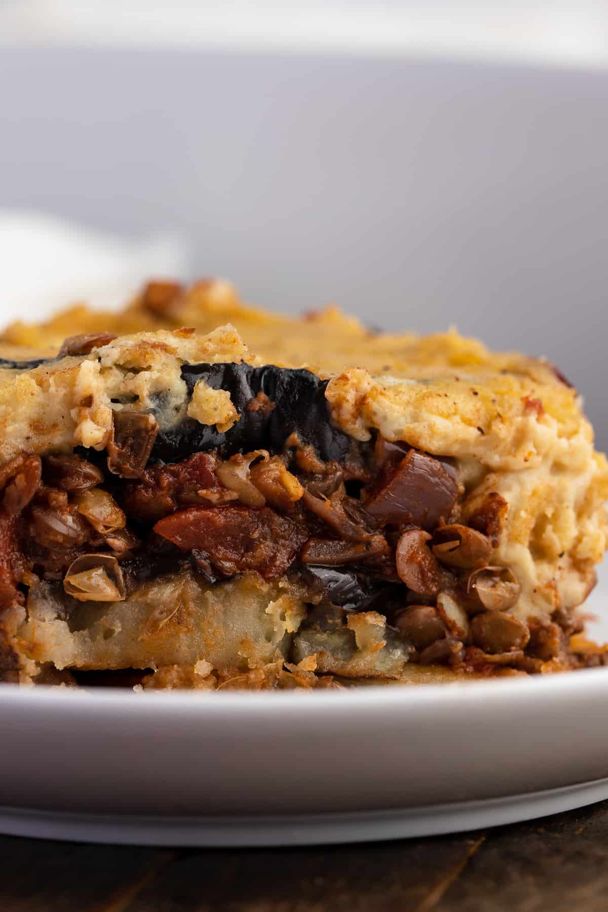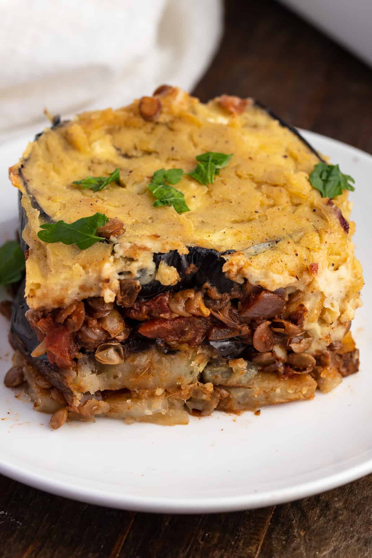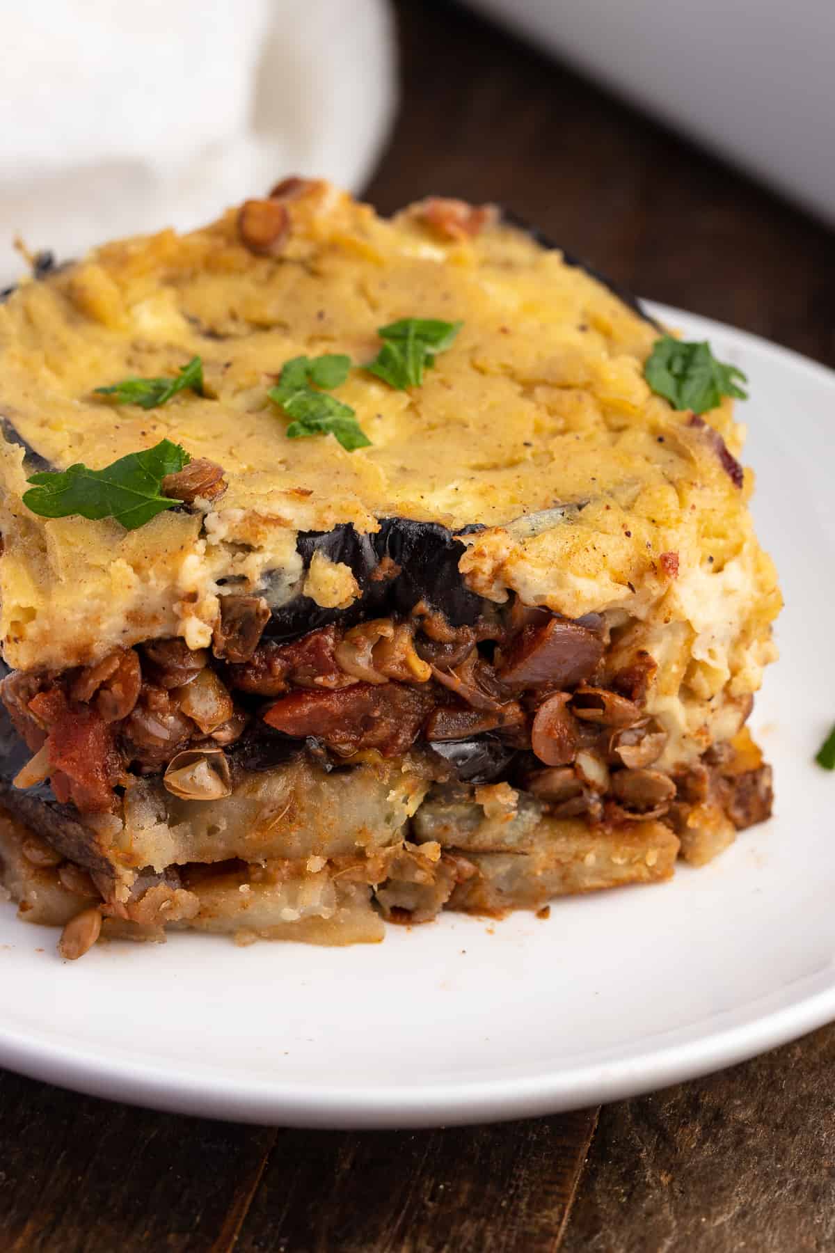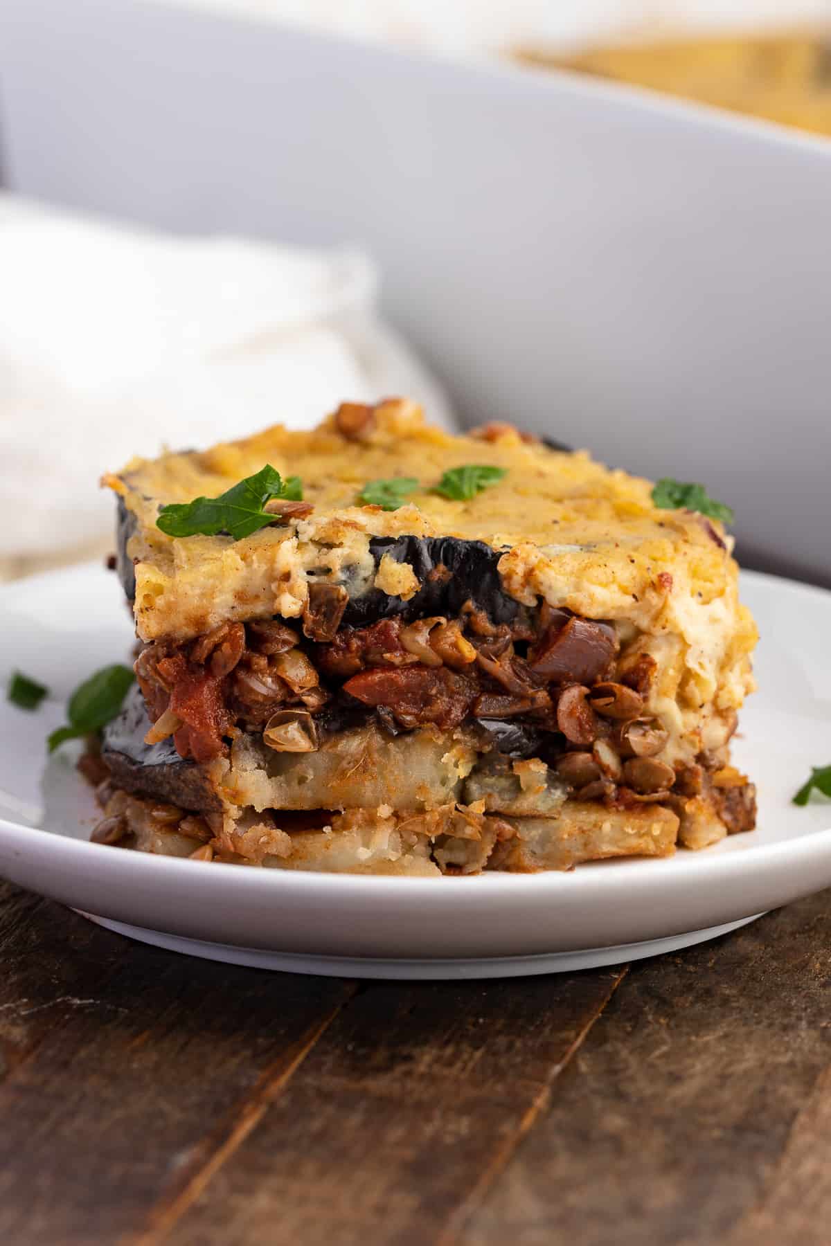 To serve, remove your vegan moussaka with lentils from the oven and let it rest for 10-15 minutes until it has cooled down a bit. This will help you cut the dish without it falling apart!