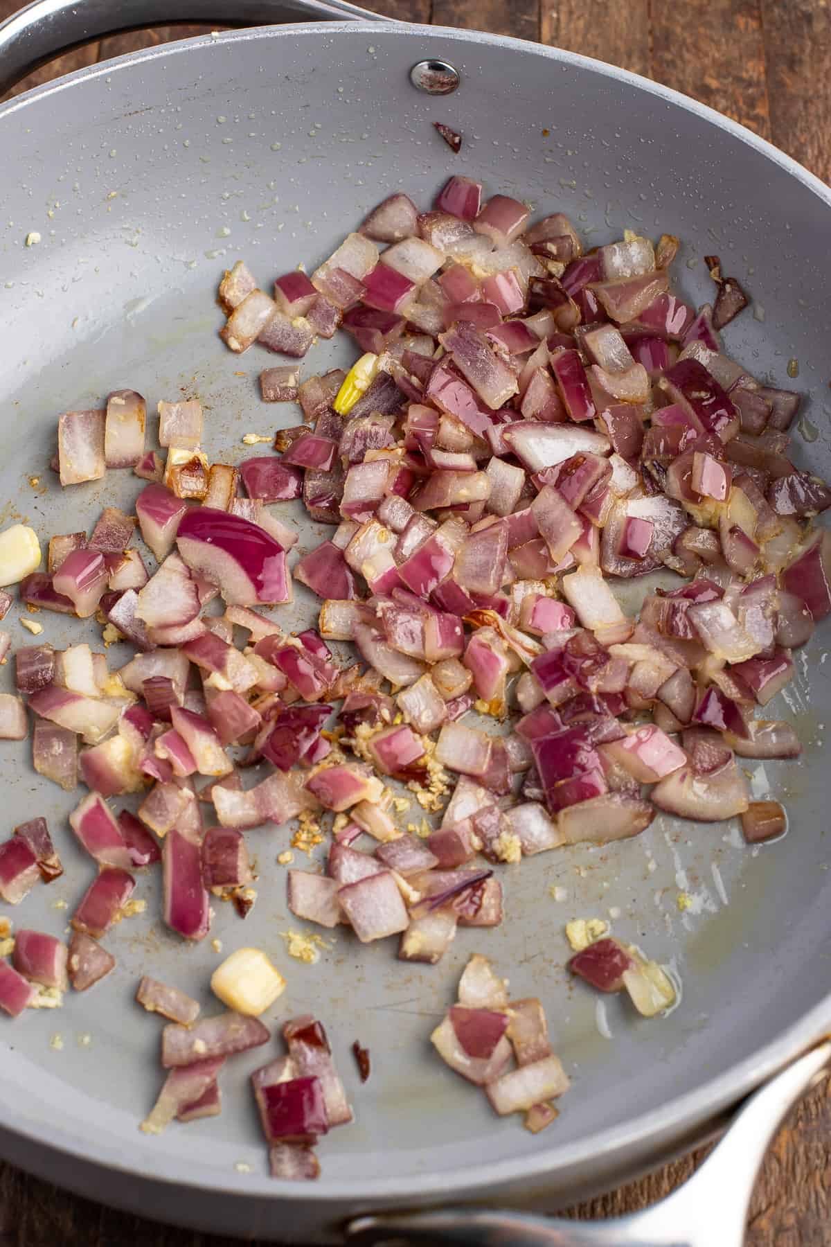 Then in a large saucepan, warm 2 tablespoons of olive oil over medium-high heat. Add the red onion and cook for 5-6 minutes until translucent and just beginning to color. Add the crushed garlic and cook for another minute until its aroma is coming through.